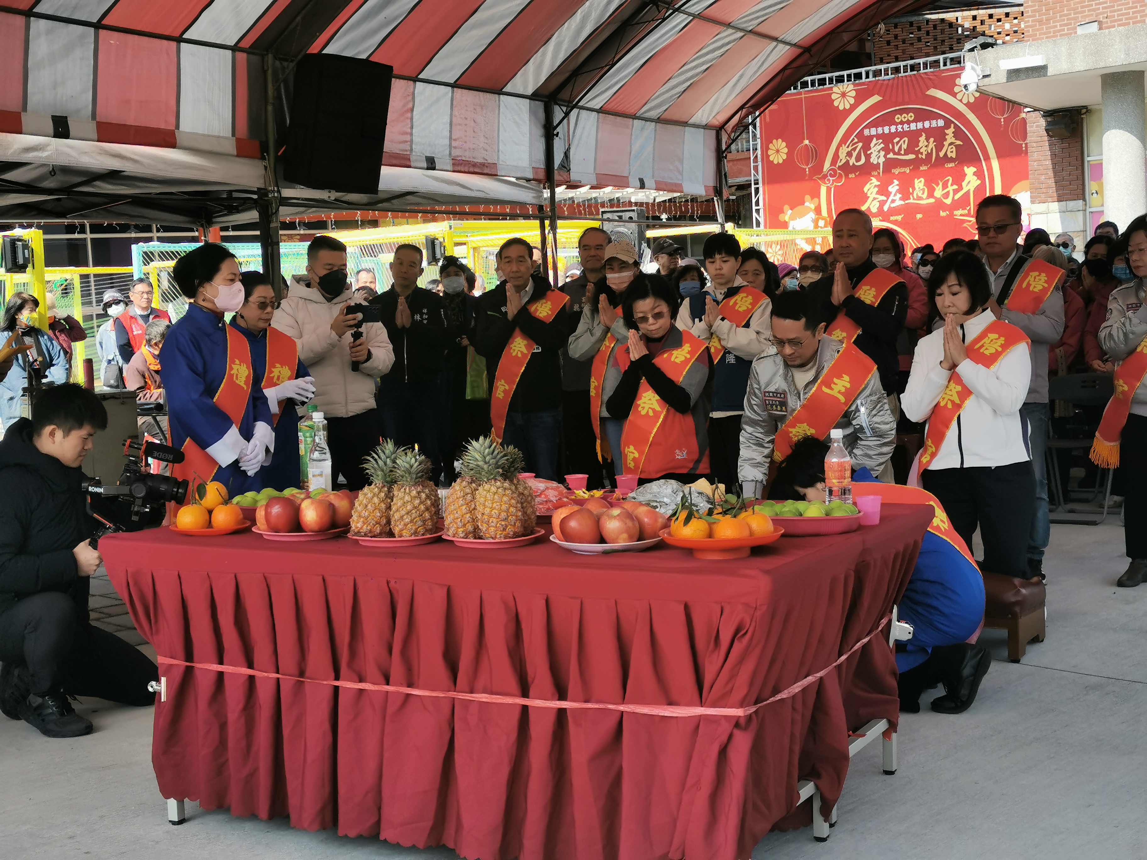 2025桃園天穿日活動祭天儀式,現場準備鮮花素果及客家粄食,以此感念女媧補天的恩澤。