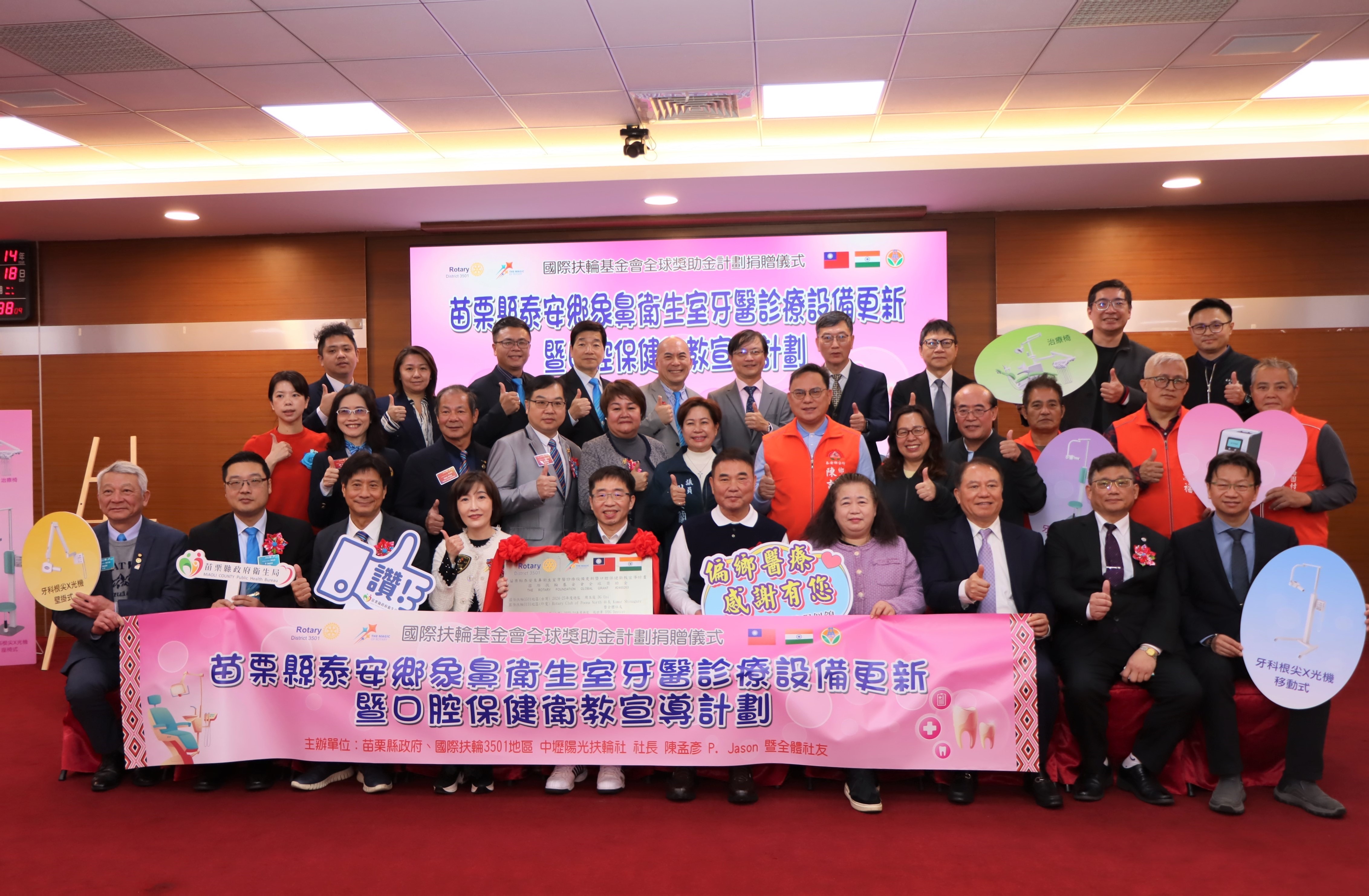 2月18日於苗栗縣政府舉辦捐贈儀式,苗栗縣衛生局楊文志局長代表受贈,健保署北區業務組林寶鳳組長代表出席,苗栗縣政府鍾東錦縣長、苗栗縣泰安鄉陳吉基鄉長、牙醫師公會謝喬均理事長及國際扶輪社張世澤總監、周玉庭總監及多位代表與會。會中林寶鳳組長向國際扶輪社善舉及苗栗縣牙醫師公會組醫療團,將醫療服務送進偏鄉,表達謝意。