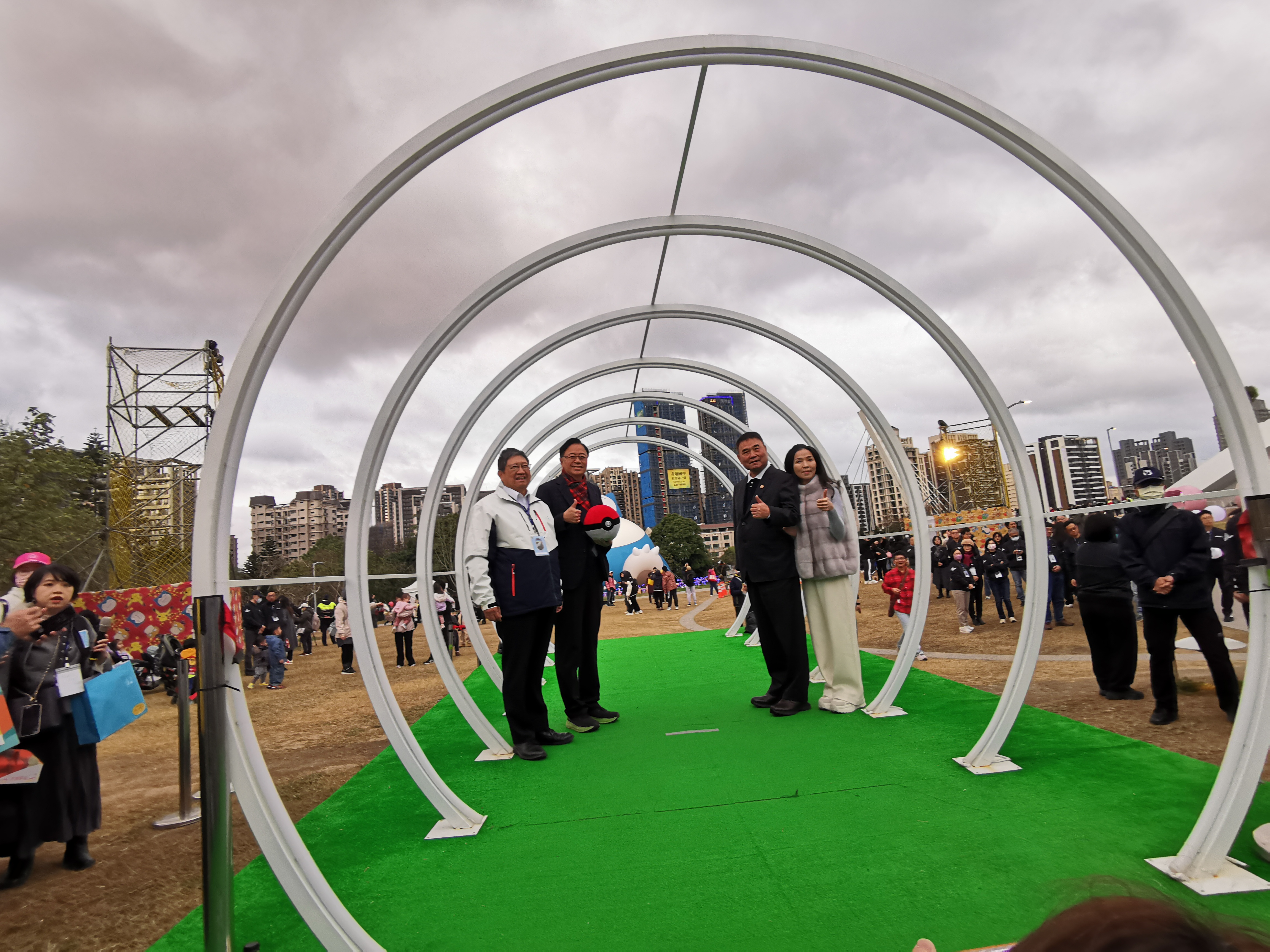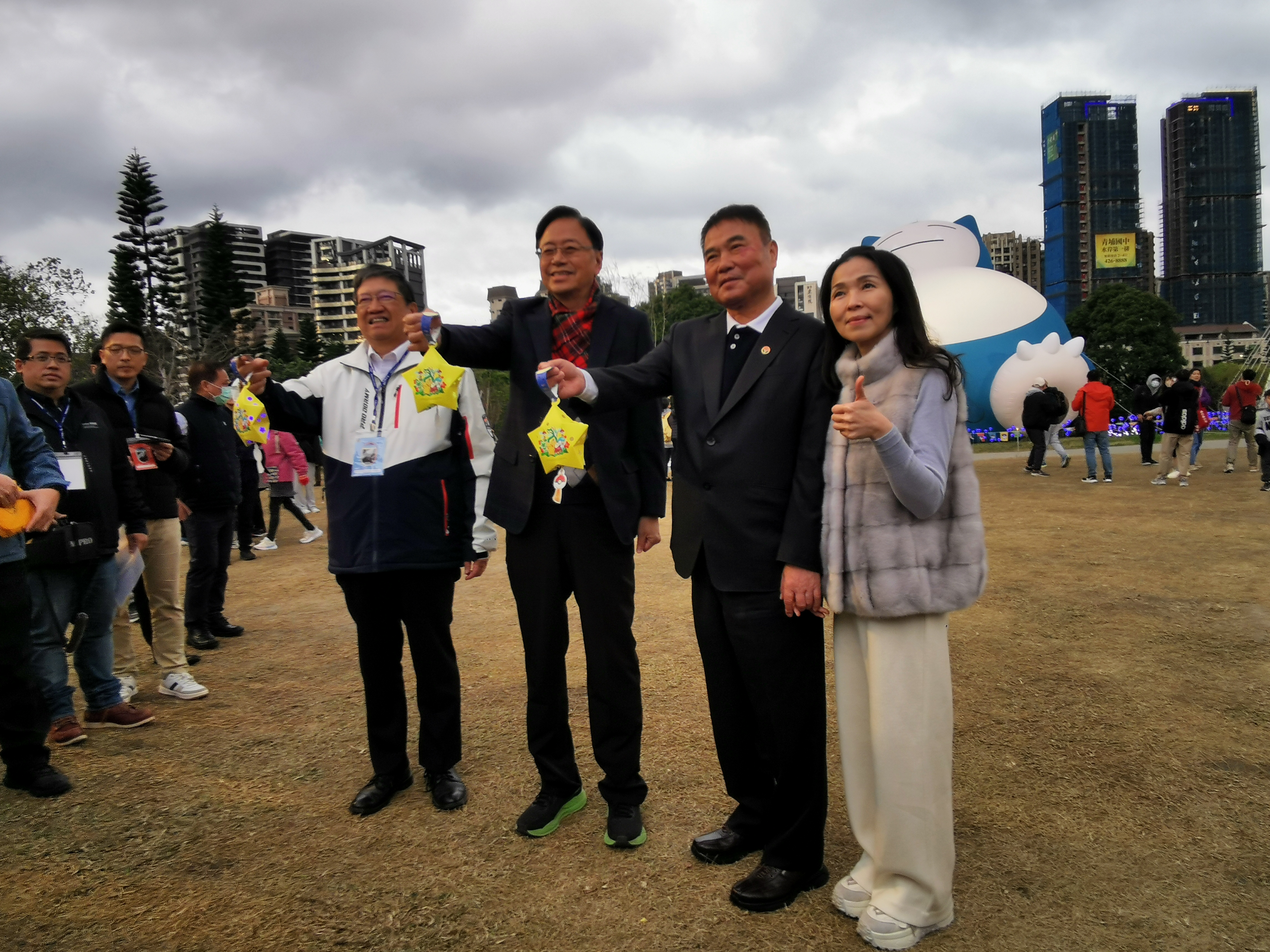 新竹縣長楊文科、苗栗縣長鍾東錦和桃園市長張善政2月18日齊聚桃園市台灣燈會,3名首長手持可愛的寶可夢小提燈與巨型卡比獸合影,共同祝福大家「蛇馬攏順」,期許新的一年萬事如意。