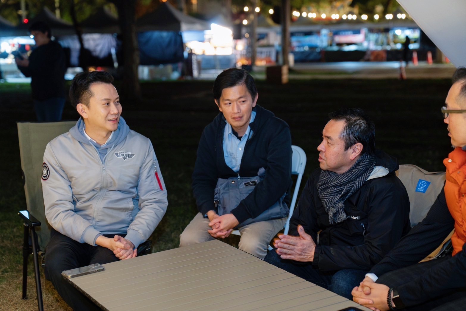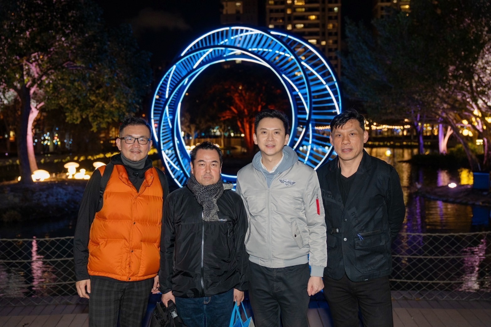 竹北光節網路熱議譽為仙境,吸引中華民國工業設計協會理事長張漢寧(左1)、日本工業設計公司GK Kyoto 麻田風兒社長(左2)等人特地前來參訪。 圖/竹北市公所提供