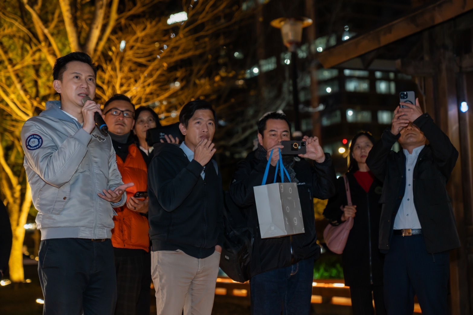 市長鄭朝方擔任導覽解說員,為遠道而來的日本貴賓及市民朋友說明六大燈區特色。 圖/竹北市公所提供