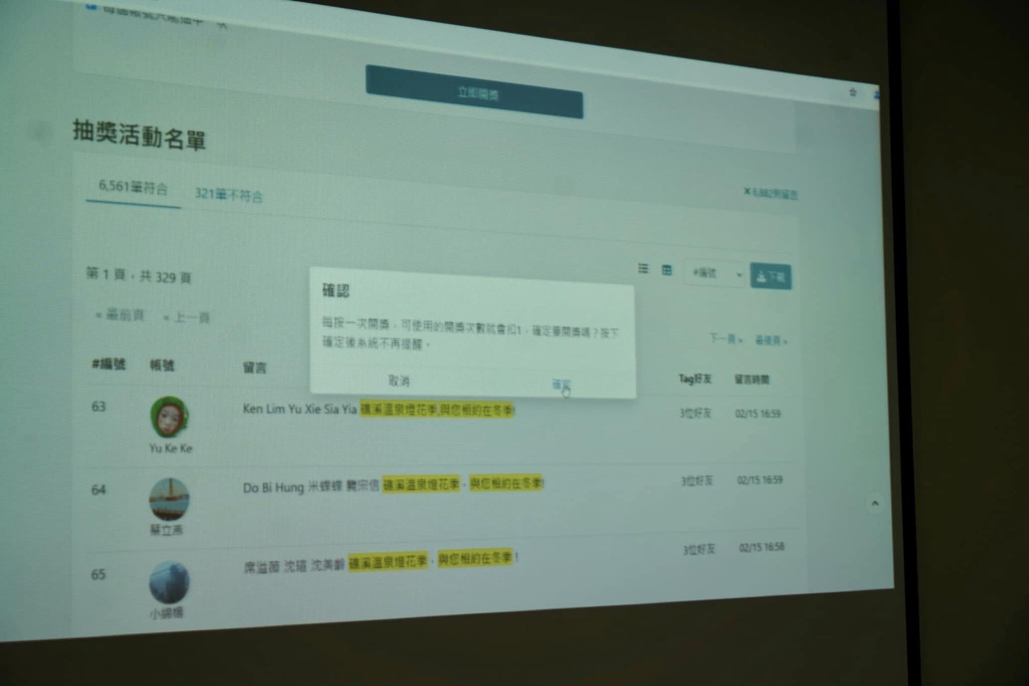第二波抽獎活動於 (今)114年02月20日公開抽獎,並由本所法務人員見證,計有礁溪山形閣溫泉飯店-平日標準房(或雙床房)住宿兌換憑證-1名、礁溪老爺酒店-礁溪老爺雲天自助餐廳午餐券(平日)2張-1名、礁溪長榮鳳凰酒店-慢活SPA+桂冠自助早午餐券(平日)2張-1名、川湯春天溫泉飯店(旗艦館)-川湯春天旗艦館平日溫泉SPA(2張)-10名、礁溪9號溫泉旅店-九遊券(限九號溫泉旅店使用)2張-5名、礁溪寒沐酒店-礁溪寒沐映之湯(湯屋居)平日券-2名、中冠礁溪大飯店-星河傳說溫泉水世界(平日)泡湯券2張-10名、雪山溫泉會館-平日雙人客房湯屋券-2名、湯城溫泉會館-新潮日式風呂雙人湯屋(平日)-5名、阿先湯泉-精緻湯屋券(平日)-1名、美嘉美大飯店-溫泉雙人套房平日住宿券-2名、和風時尚會館-戀戀和風雙人房平日住宿券-1名、礁溪晶泉丰旅-泉茗客房平日住宿券-1名、帝王行旅-經典雙人房住宿券(平日)-1名、冠翔泉旅-泉境SPA平日泡湯券2張-5名,共計48份好禮。