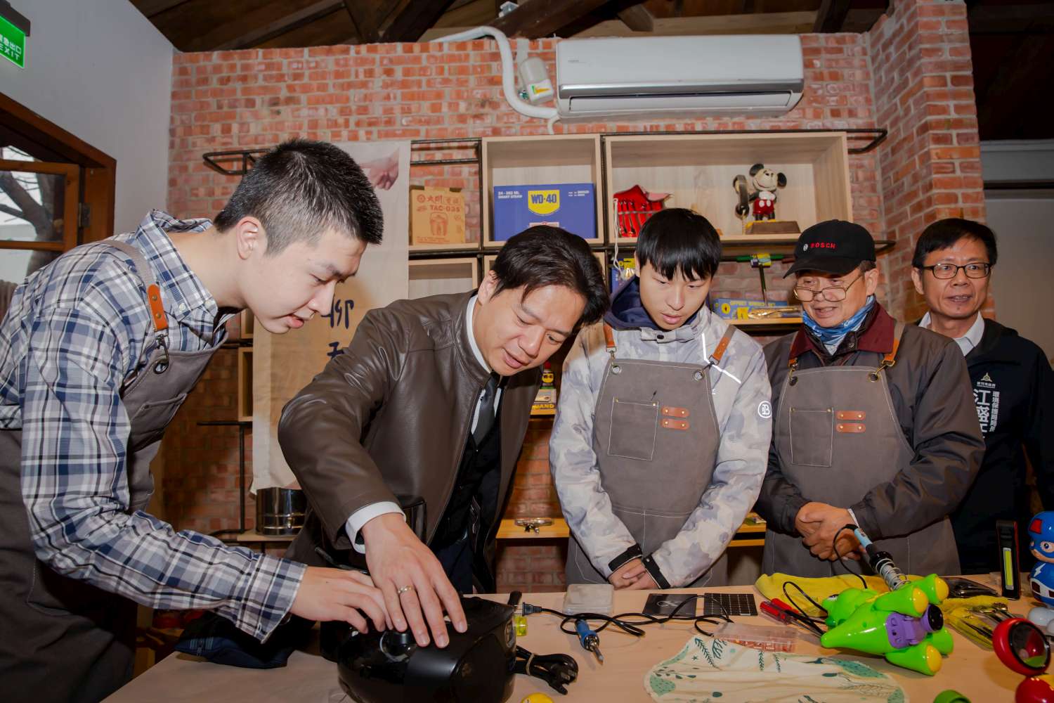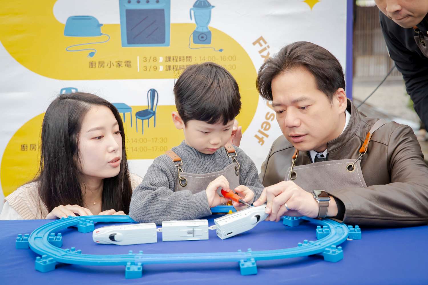 代理市長邱臣遠與小朋友一起修理電動小火車 圖/新竹市政府提供