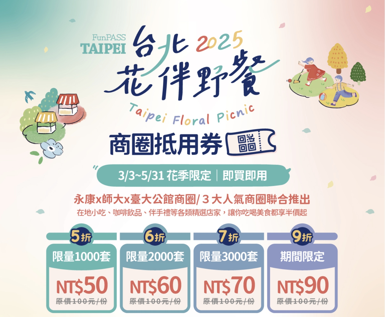 春暖花開,正是相約賞花、野餐好時機!臺北市政府觀光傳播局搭配「2025台北花伴野餐」活動,聯手三大商圈推出限量100元商圈抵用券,明(3)日早上10起於北北基好玩卡網站開賣,旅客有機會以最低5折價購入,享受賞花的樂趣的同時,還能盡情探索臺北的豐富美食與特色小店,打造愜意的春日漫遊。