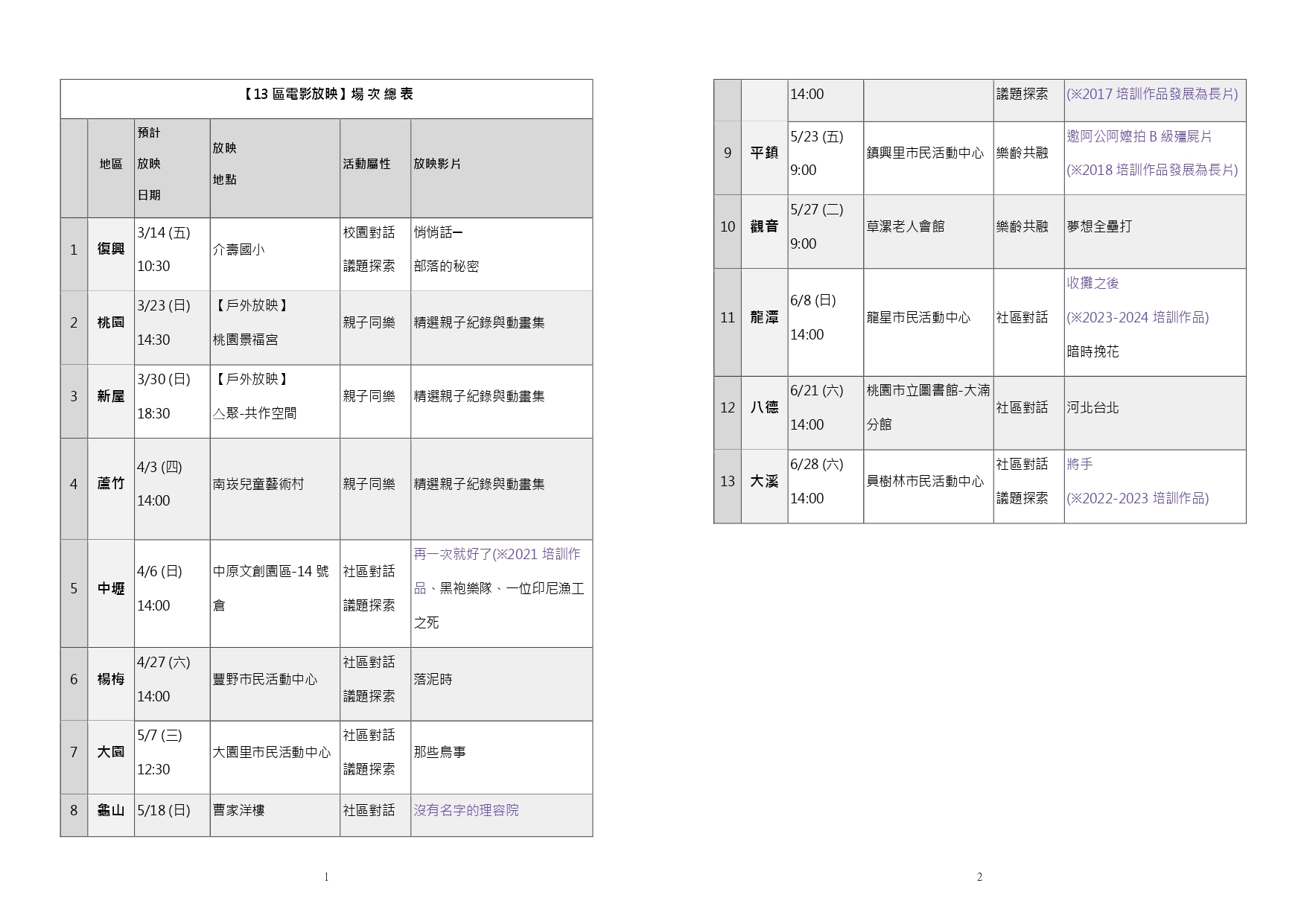 2025年「桃園城市紀錄片」一年一度的社區放映活動即將登場!「桃仔園電影趴:來咱社區看電影!」從3月14日至6月28日,13場電影放映將深入桃園各社區。今年電影趴以「電影放映 X 特色點心 X 社區交流」為題,設計主題片單、提供特色點心、邀請導演出席映後交流,以及集點兌換贈品等豐富活動,展現社群對話、闔家觀賞的特色,「桃仔園電影趴」邀請民眾共襄盛舉,一起走踏桃園13區! 「桃仔園電影趴」以多元影像呈現在地文化,針對各區議題、文化脈絡規劃了多樣性主題,類別涵蓋紀錄片、紀實節目、親子動畫片等類型,片單主題囊括:環境生態、移民工、多元族群、家庭關係、長輩照護、工藝傳承等面向,另外也藉放映活動,推廣桃園城市紀錄片的培訓作品。