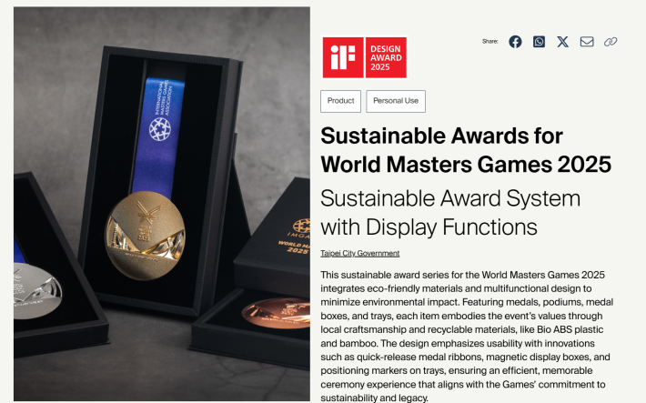 2025雙北世界壯年運動會永續頒獎系統設計,從66國、11,000件參賽作品中脫穎而出,榮獲全球設計界最高榮譽之一德國iF設計獎(iF DESIGN AWARD)肯定!這項榮耀不僅提升了2025世壯運獎牌的價值,也讓每位站上頒獎台的選手,同時獲得國際級賽會勝利及設計大獎的榮耀。