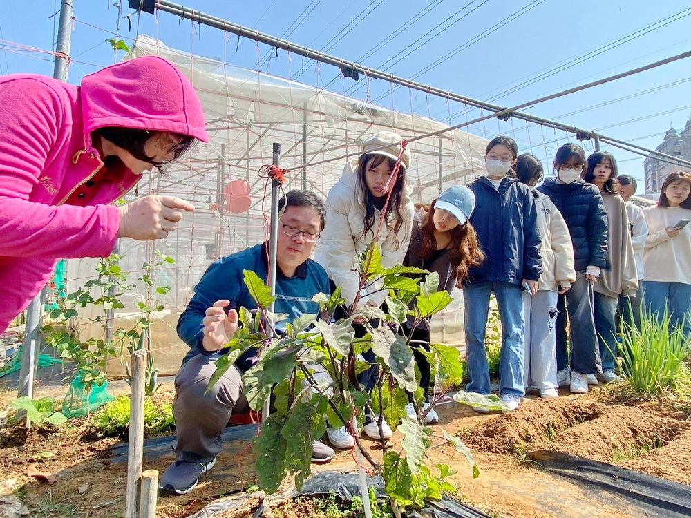 圖1:嘉義大學植物醫學系林彥伯助理教授(左二)向學生解說有機栽培田區耕作模式和病蟲害防治。圖/嘉大提供