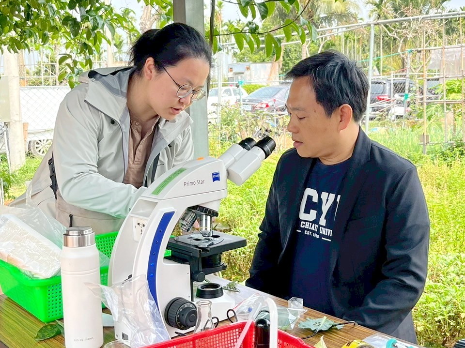 圖4:妙手虫森團隊向嘉大農學院江彥政副院長(右)解說作物真菌性病害孢子外觀。 圖/嘉大提供