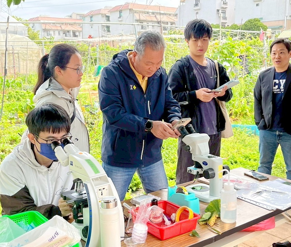圖5:江振章里長(中)透過顯微鏡觀察並拍攝作物害蟲。 圖/嘉大提供
