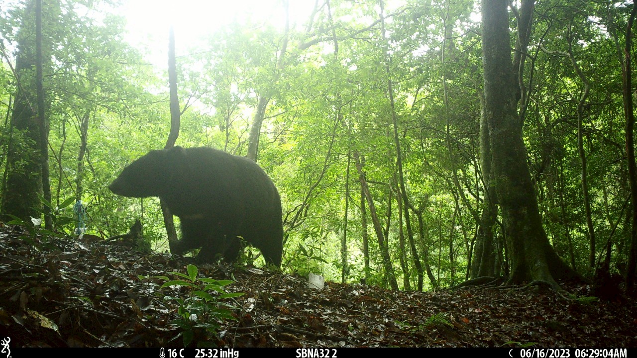新竹分署為瞭解臺灣西北區域臺灣黑熊之分布概況,委託團隊進行區域調查計畫,109年透過紅外線自動相機拍攝到北臺灣第一筆黑熊監測影像。(林業保育署新竹分署提供)