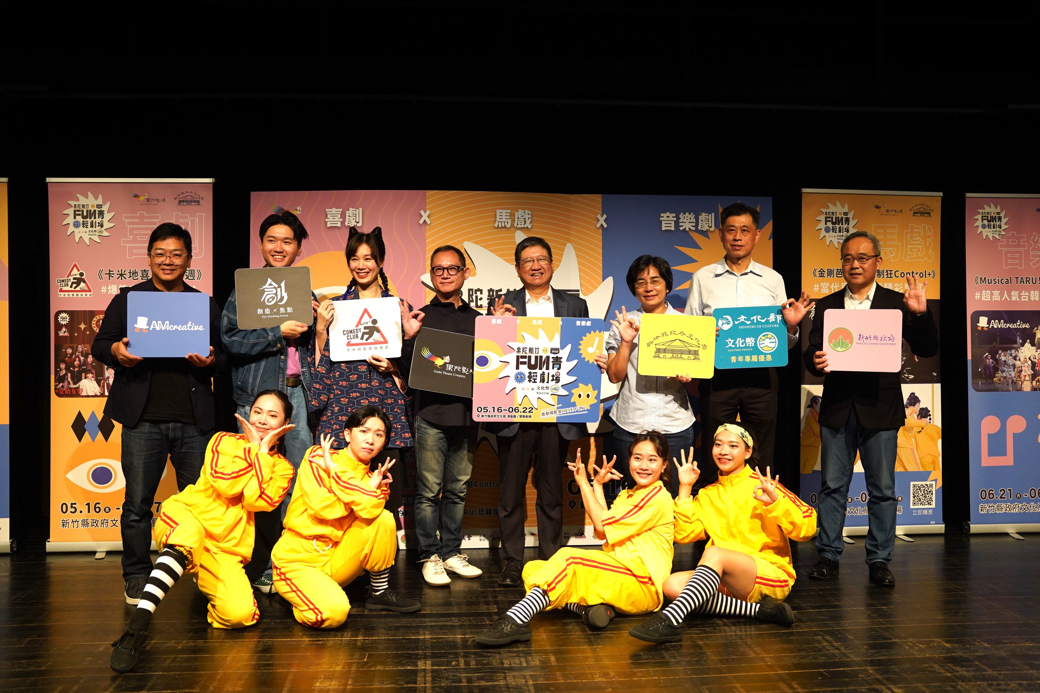 由新竹縣政府文化局主辦、果陀劇場承辦的「2025果陀新竹FUN青輕劇場」自去年推出深受觀眾喜愛,今年5月16日到6月22日將再度於新竹縣政府文化局演藝廳及實驗劇場推出多元類型演出節目,活動記者會今天(10日)舉辦,邀請括卡米地喜劇俱樂部、Eye Catching Circus 創造焦點以及AMcreative 安徒生和莫札特的創意共同宣傳,新竹縣長楊文科也欣賞演出,邀請大眾、青年共同進劇場,支持表演藝術。