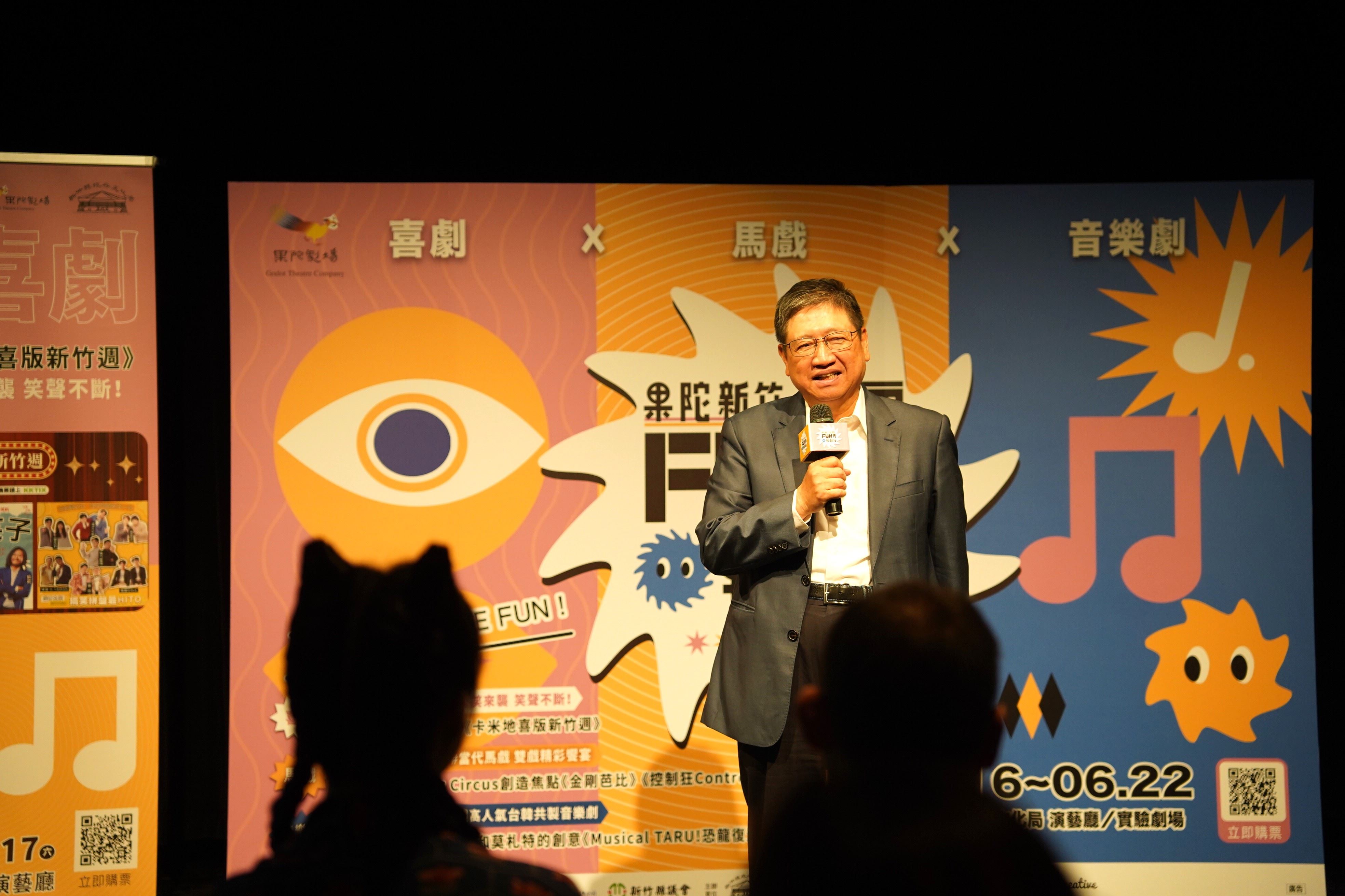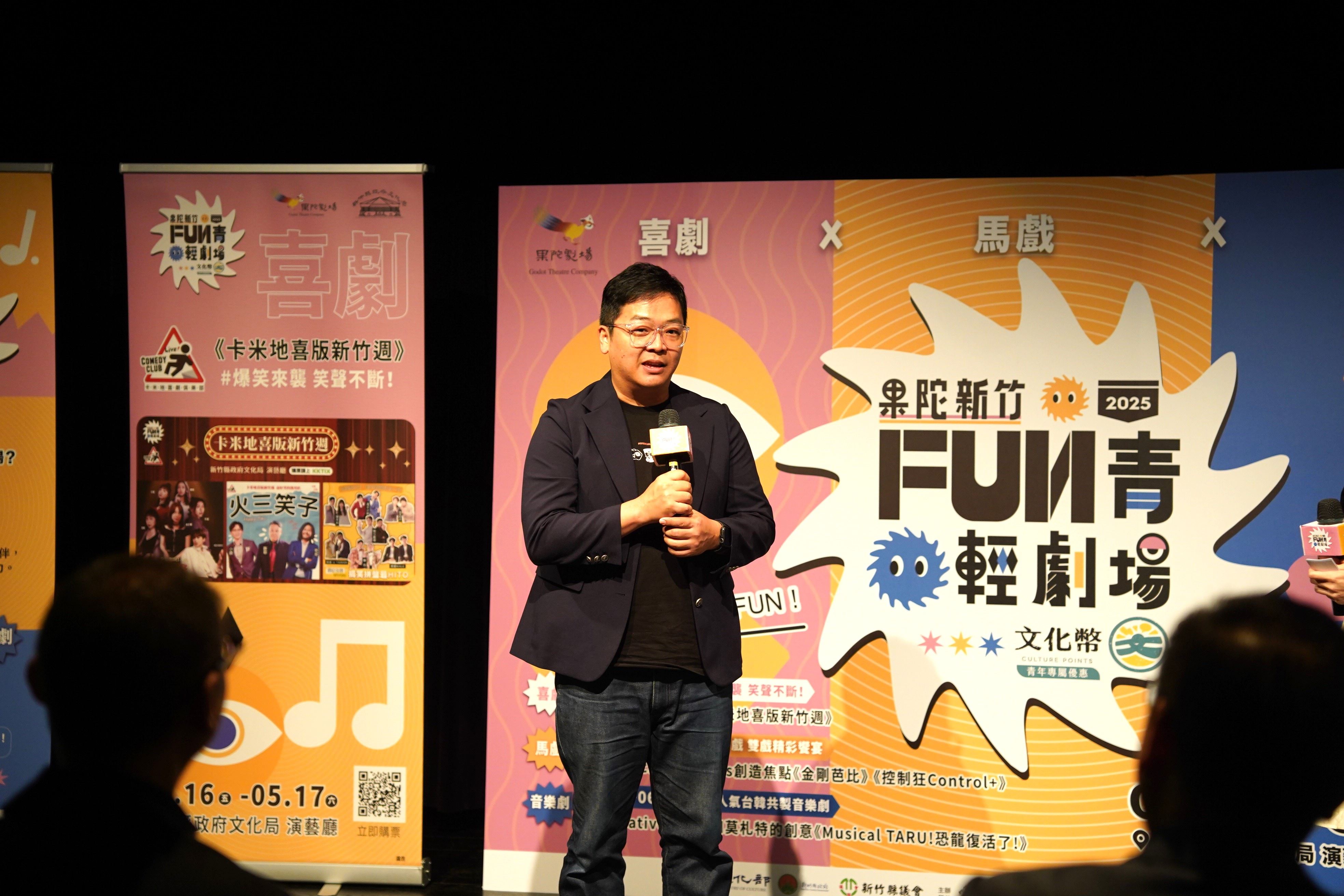 楊文科指出,果陀劇場已是第2年承辦「2025果陀新竹FUN青輕劇場」,讓青年朋友感受到劇場及表演藝術的魅力,新竹縣除了是科技首都,對於文化的支持也十分有力,他期待文化能量持續向下扎根,並鼓勵青年、青少年一起使用文化幣,欣賞高水準表演。