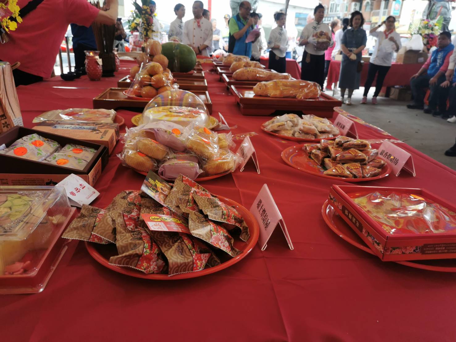 每年農曆3月23日為媽祖娘娘誕辰,今年的媽祖生日落在國曆4月20日,苗栗縣糕餅商業同業公會理事長賴廷基表示,公會和龍鳳宮為了幫媽祖祝壽,已連續13年舉辦「巨桃獻壽」活動。現場也使用各家糕餅舖製作的招牌特色糕點以及糕點製成的素五牲祭祀,順道也推廣苗栗名產麻糬餅。