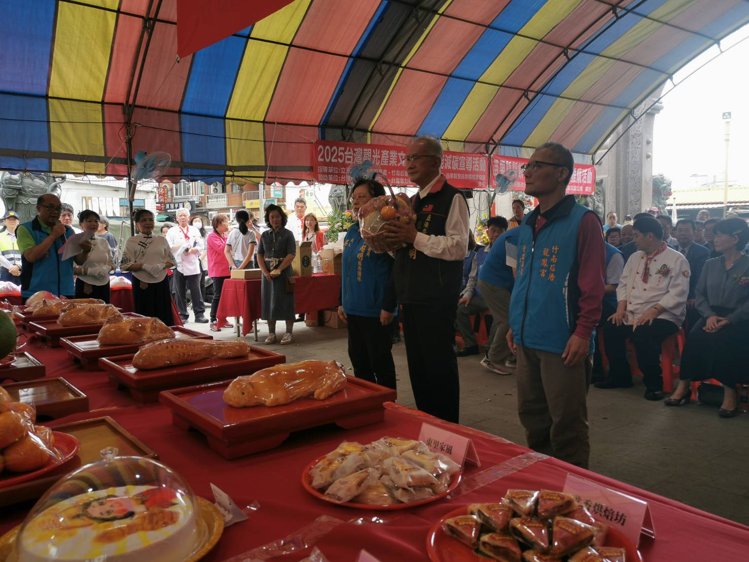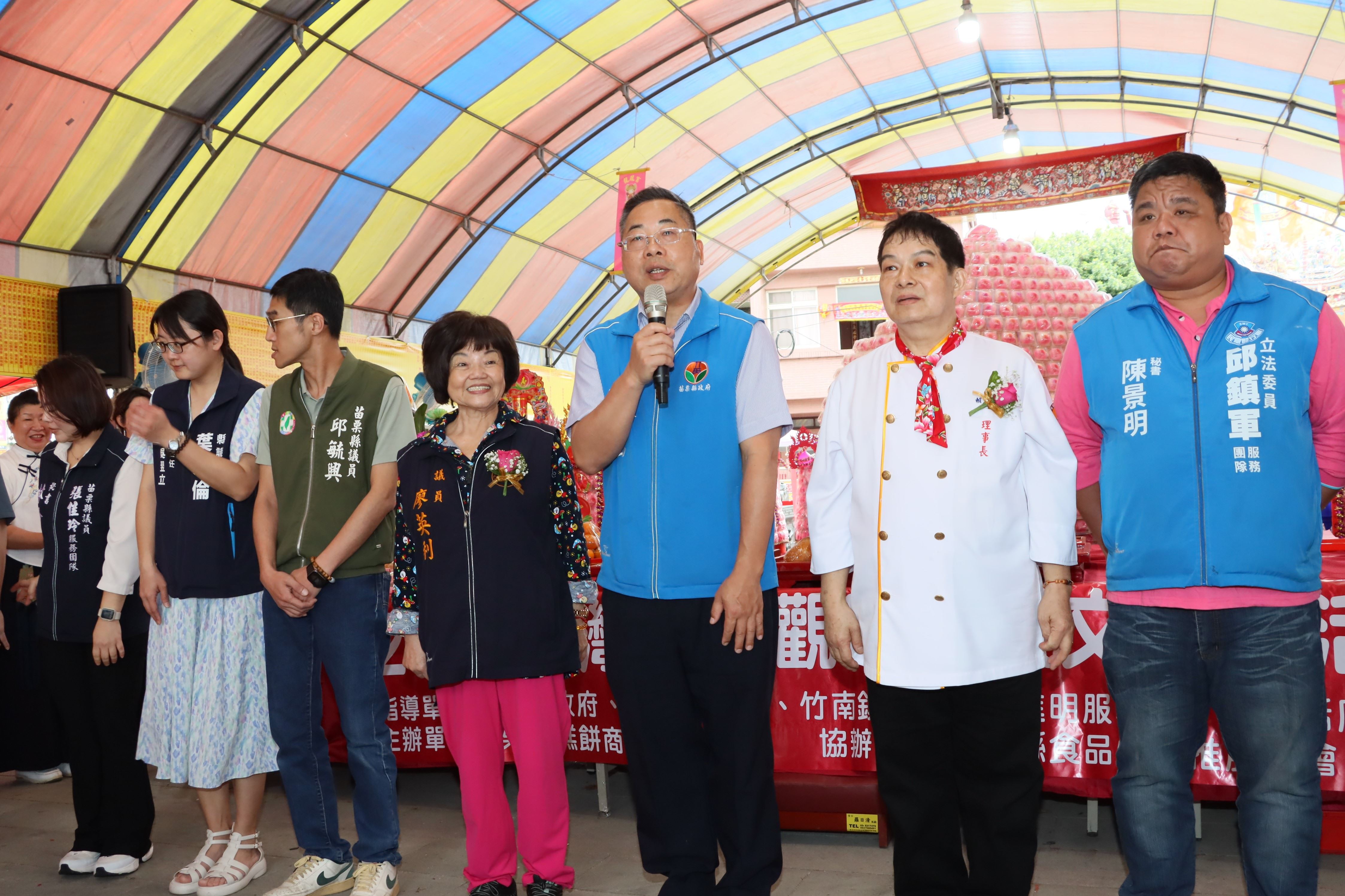 今天到場的來賓包括縣府祕書長陳斌山、立委陳超明、竹南鎮長方進興、各級民意代表、縣內多個糕餅店業者及縣府社會處祕書謝乾祥,祕書長陳斌山指出,這個活動感覺相當有宗教及文化上的意義,感恩媽祖婆保佑台灣鄉親、也感謝每位堅守在自己崗位上的民眾。他表示苗栗縣的糕餅業者在技術上精益求精,將糕餅烘焙業發揚光大,帶來許多觀光效益,歡迎大家今天一起來、熱熱鬧鬧為媽祖暖壽,縣府也會全力配合民間在文化、宗教、及公益事業的各個活動。