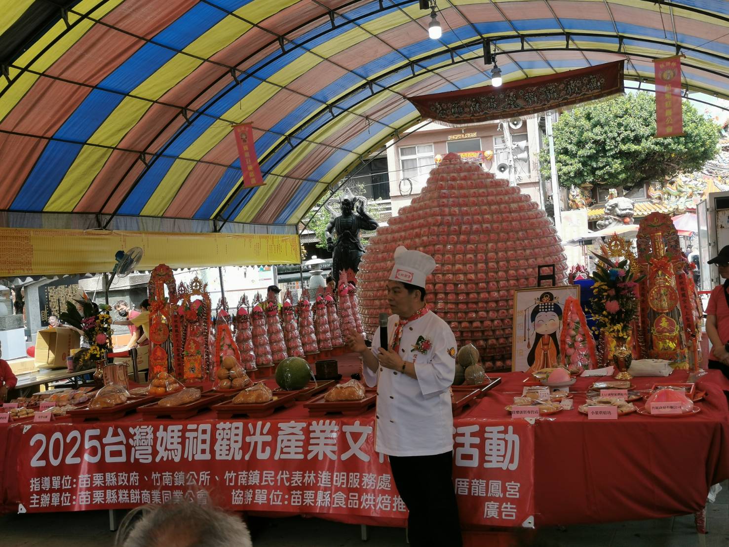 「2025台灣媽祖觀光產業文化祭-巨桃獻壽活動」,4月12日在竹南后厝龍鳳宮前廣場舉辦,苗栗縣糕餅業者以八千顆小壽桃,打造一個24層巨型壽桃,並舉辦祈福祭祀,苗栗縣政府祕書長陳斌山表示活動相當具有宗教及文化意義,也歡迎大家一起來苗栗慶祝「媽祖生」。