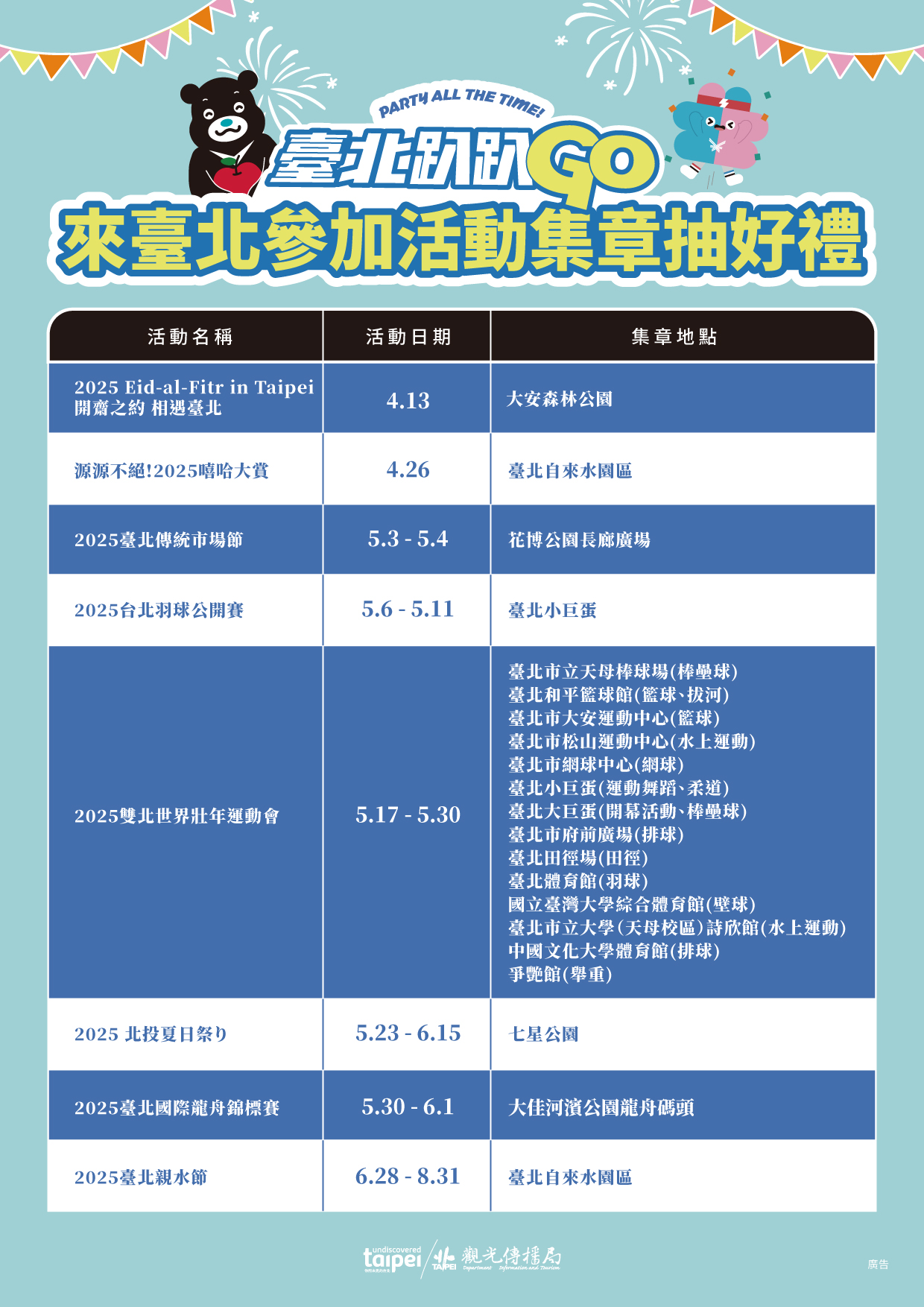 臺北市的第二季活動以運動賽事與多元文化為主軸,觀傳局特邀奧運金牌連霸國手李洋,透過線上直播為「臺北趴趴GO」揭開序幕,介紹包括5月登場的國際體壇盛事「2025雙北世界壯年運動會」,迎接百餘國熱血選手們齊聚「運動之都」臺北,盡情享受這場結合體育與觀光文化的嘉年華會;本季活動還有「Eid-al-Fitr in Taipei 開齋之約 相遇臺北」、「源源不絕!2025嘻哈大賞」、「臺北傳統市場節」、「台北羽球公開賽」、「臺北親水節」、「臺北國際龍舟錦標賽」及「北投夏日祭り」等八大特色活動接力登場,臺北市將以國際運動賽事與多元文化慶典,邀請全民共度熱力四射的夏季。