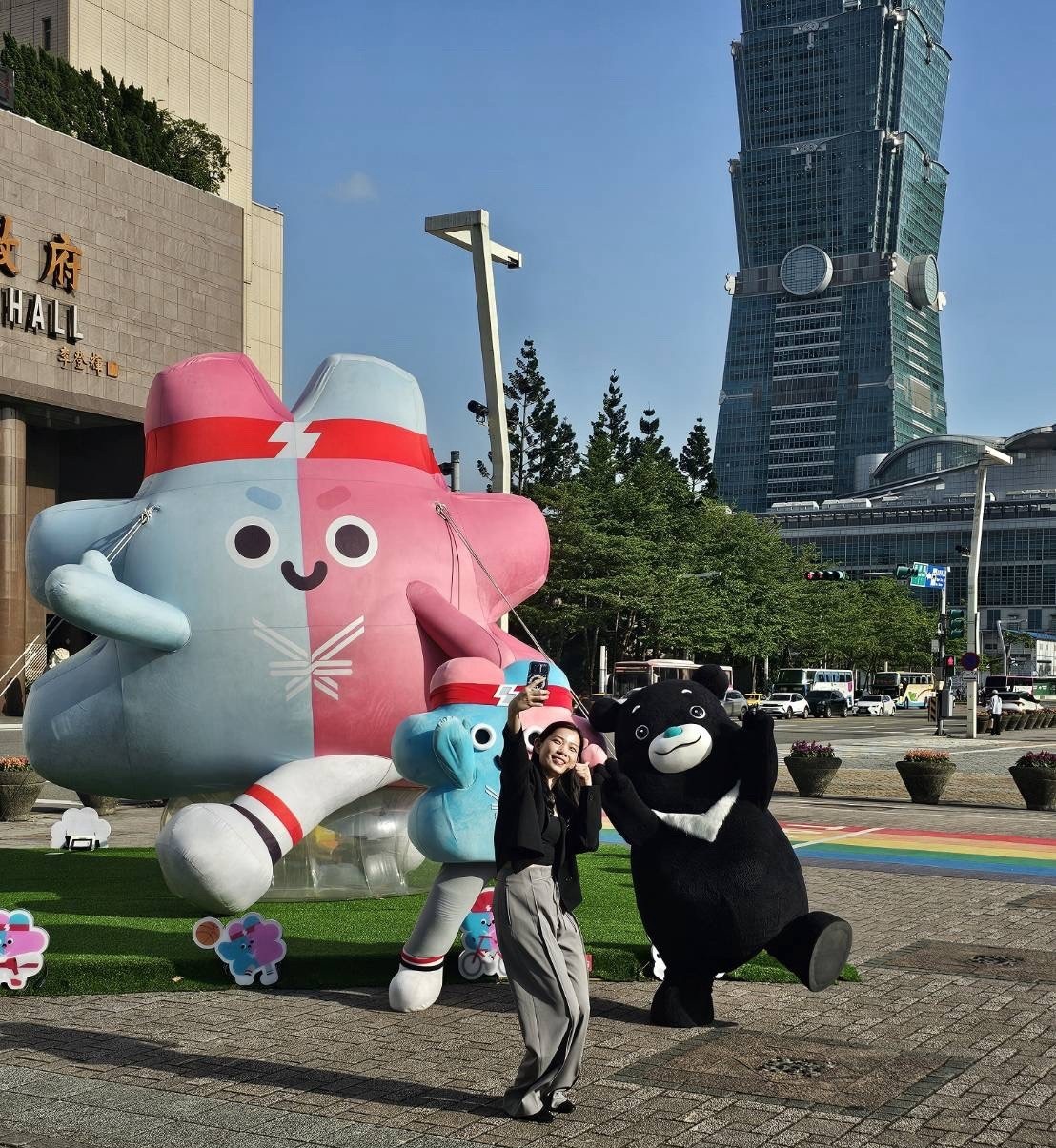 在臺北市民廣場前的「壯寶氣偶」已成為臺北市最熱門打卡景點,觀傳局長余祥與吉祥物壯寶、熊讚一起合影宣傳2025雙北世壯運。 臺北觀傳局提供