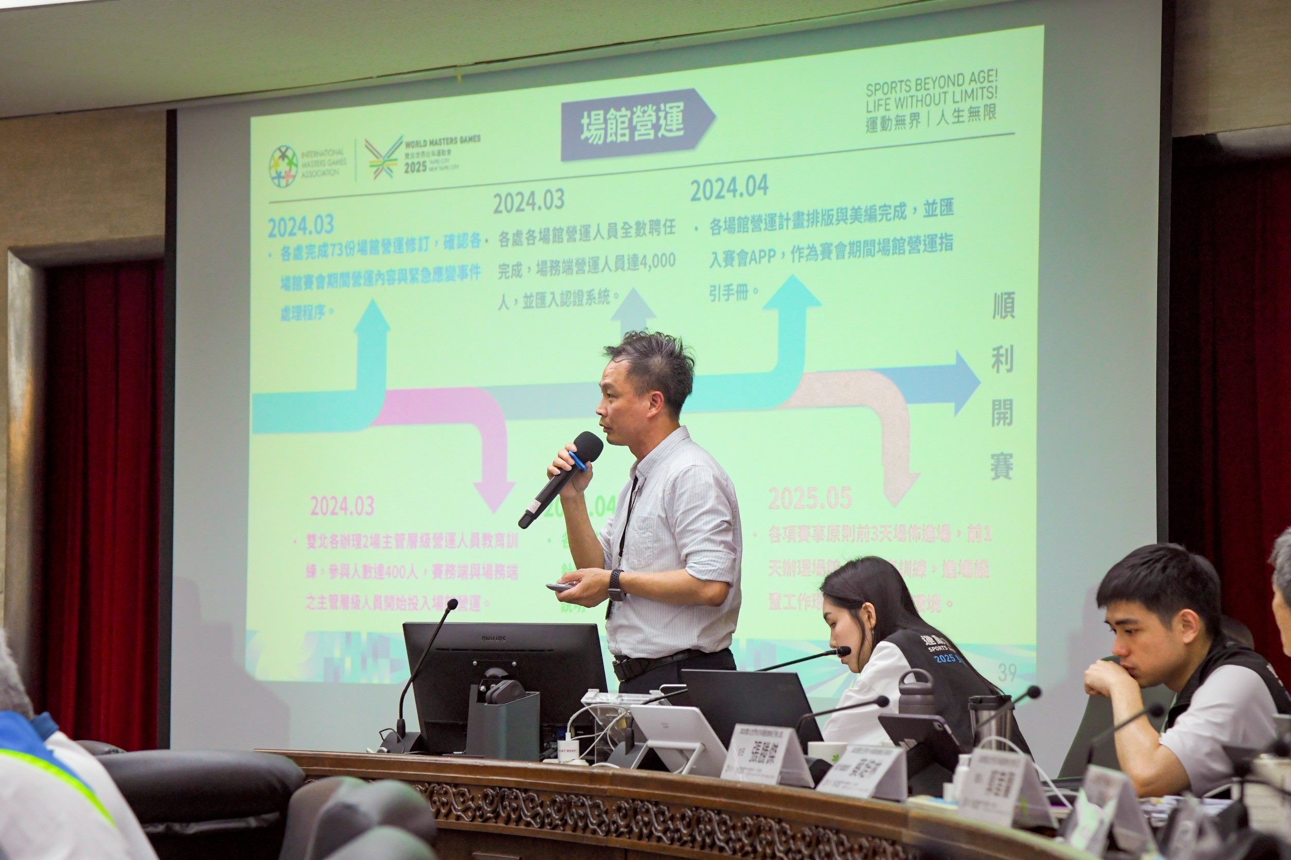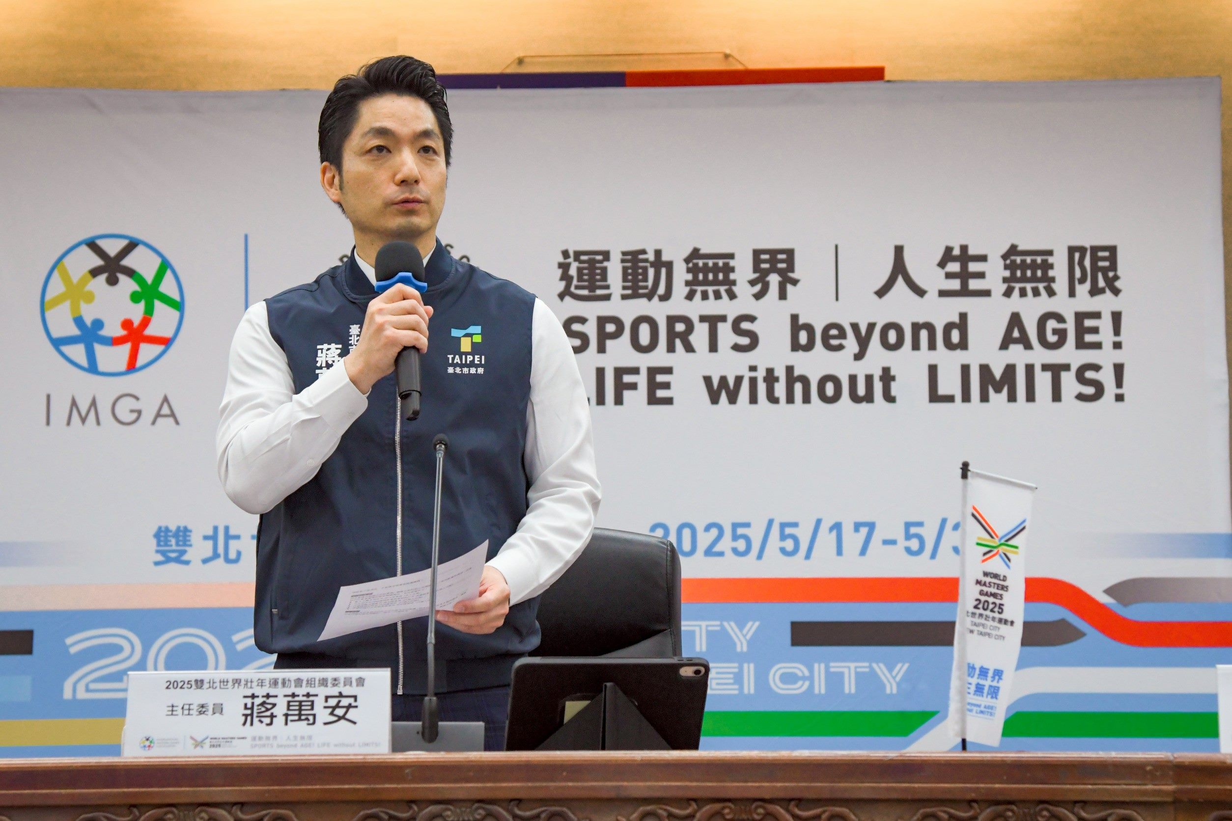 蔣萬安表示,這是亞洲首次舉辦世壯運,賽會參與人數歷屆第三、僅次於壯年運動風氣盛行的紐、澳。2025雙北世壯運參賽者年齡更突破歷屆紀錄,來自泰國105歲田徑好手以及我國103歲的羽球好手林友茂超越先前世壯運選手101歲的高齡紀錄。賽會更有10大創新亮點,包含首次雙城市主辦、賽會暖身訓練營、數位認證與專屬App、賽事即時轉播、場館數位導覽與科技輔助設施、選手歡迎晚會、選手比賽影像紀錄、世壯運國際研討會、科技醫療健檢服務以及運動科技體驗,希望讓選手有勝於歷屆賽會的參賽體驗,更能在臺北市留下美好的回憶。為了迎接帕拉選手到來,賽會也提供帕拉選手免費預約復康巴士及競賽場館相關協助,打造友善賽會,世壯運賽事免費入場,邀請全國民眾一同進場觀賽,為各國選手加油打氣,讓世界感受到臺灣的熱情與活力。