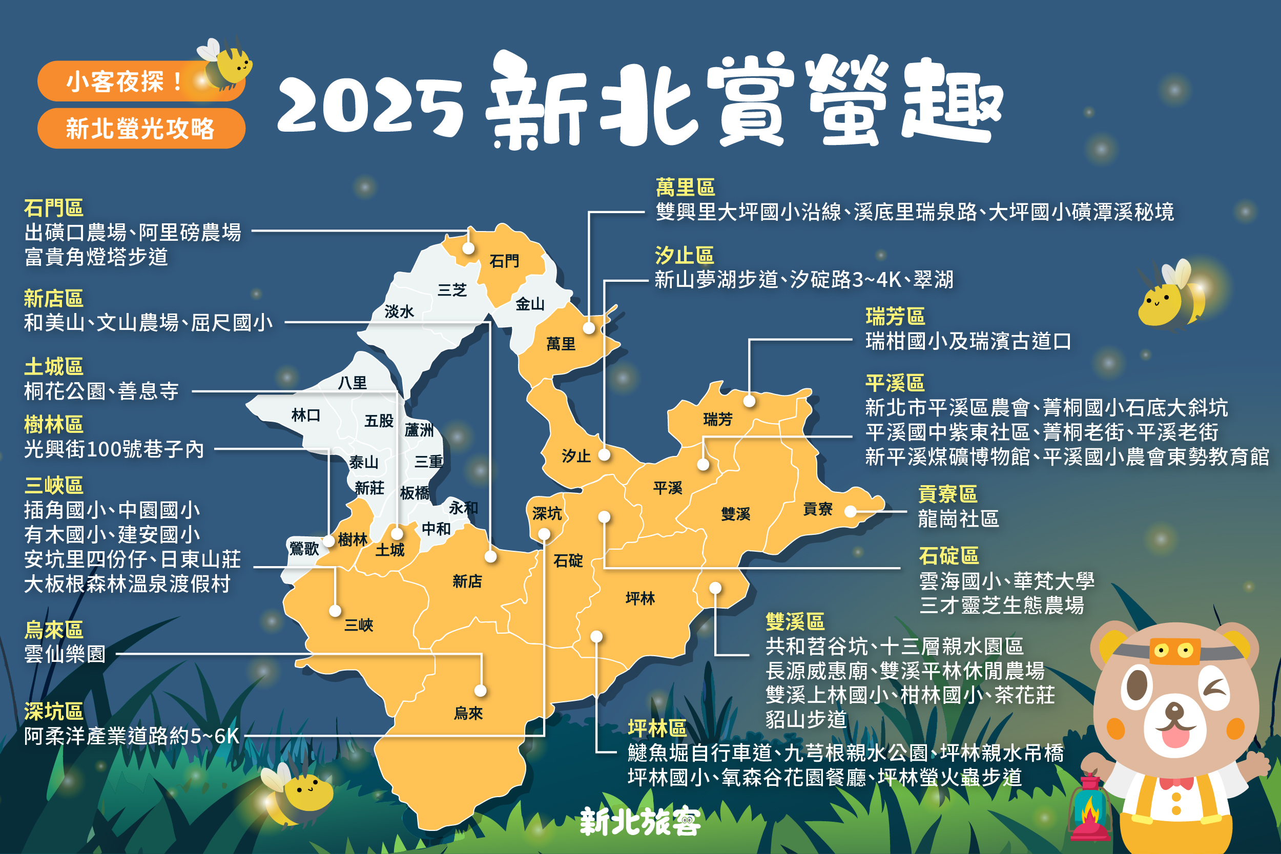 每年4月中到5月初,新北市多處賞螢秘境正悄悄綻放光芒。在白天可以走訪山林美景,傍晚在點點螢光中感受新北景區春季浪漫氛圍。為讓來訪民眾輕鬆規劃行程,新北市政府觀光旅遊局特別推出「新北賞螢地圖」攻略懶人包,精選搭乘捷運、公車、火車或騎單車即可抵達賞螢地點,還可安排在地留宿一晚,來場深度生態之旅。