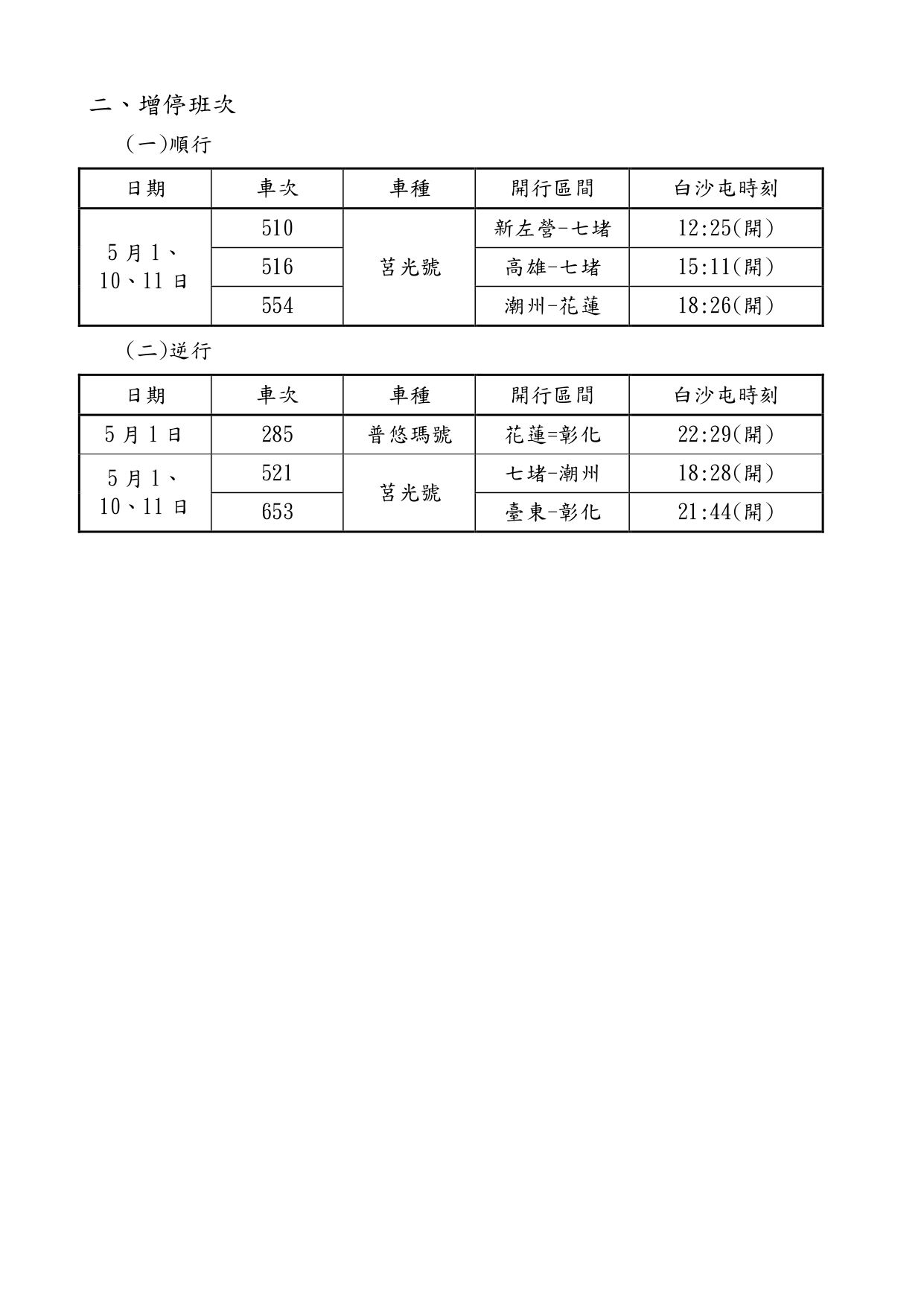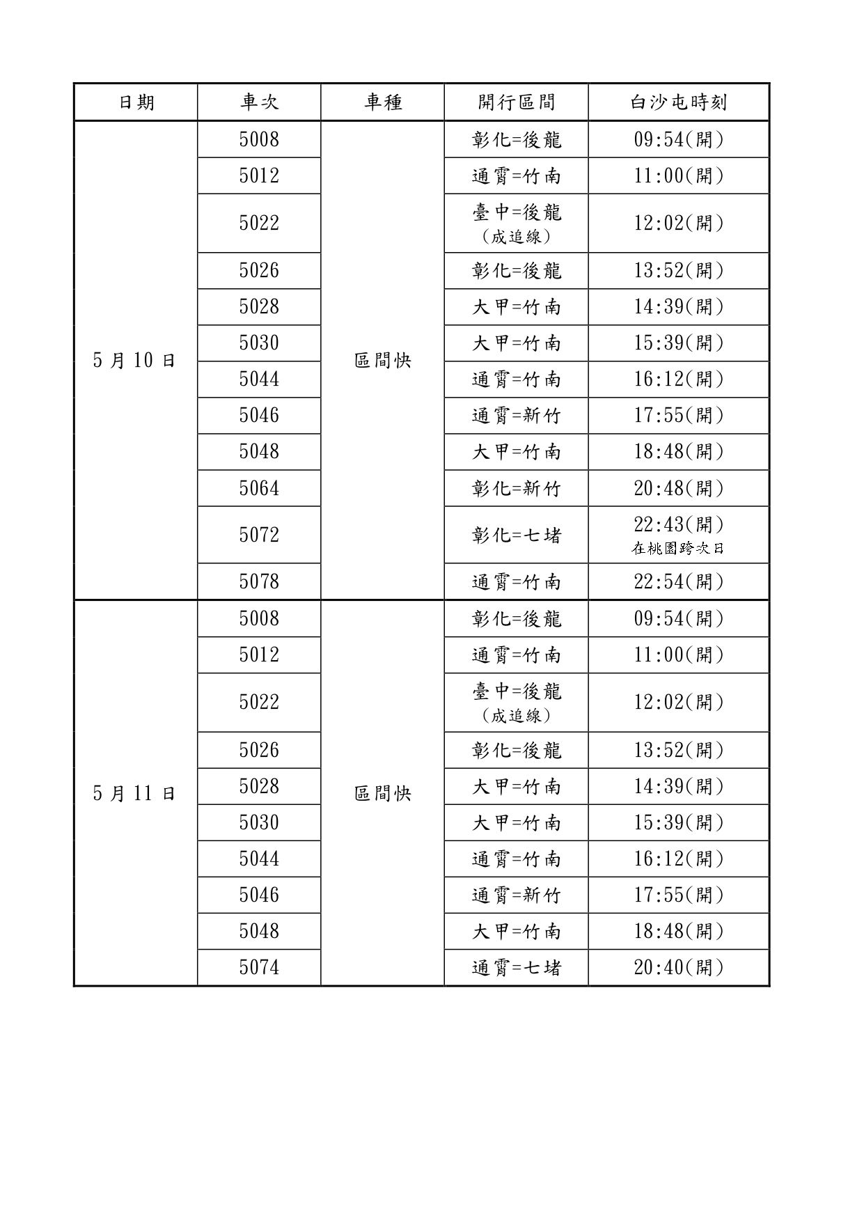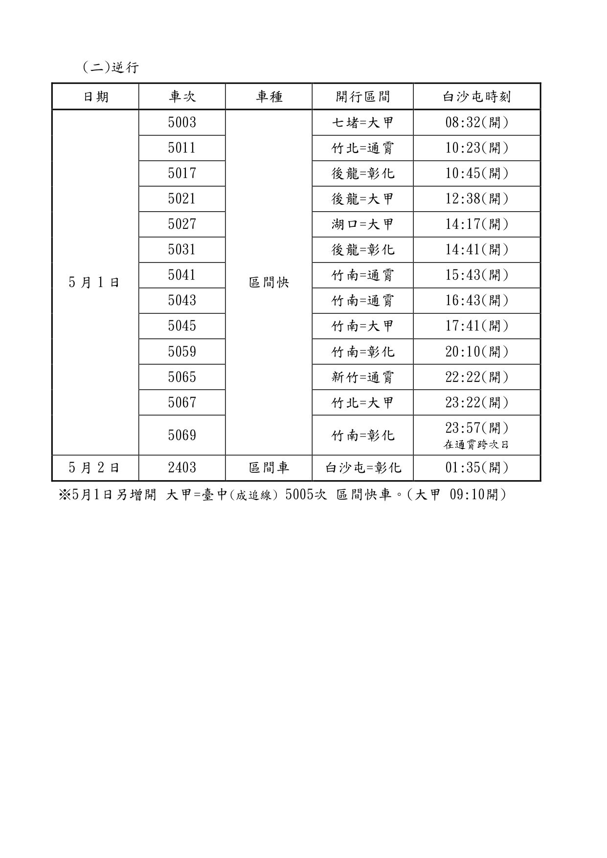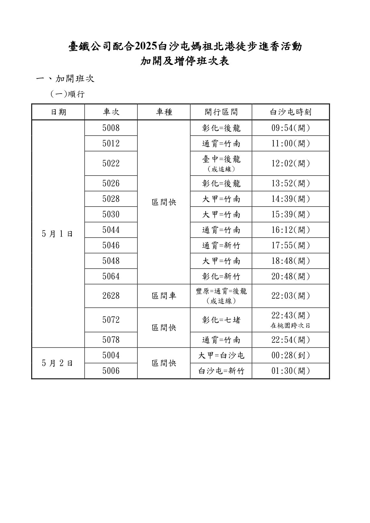 台鐵指出,去年疏運進出白沙屯站有3.7萬人次,今年因應「白沙屯拱天宮媽祖進香」預估將激增至5.5萬人,主要尖峰為5/1、5/10及5/11日三天,以加開區間列車、加掛車廂及增停方式來提升運能,共增開76列次,總運輸量可達22萬人次。