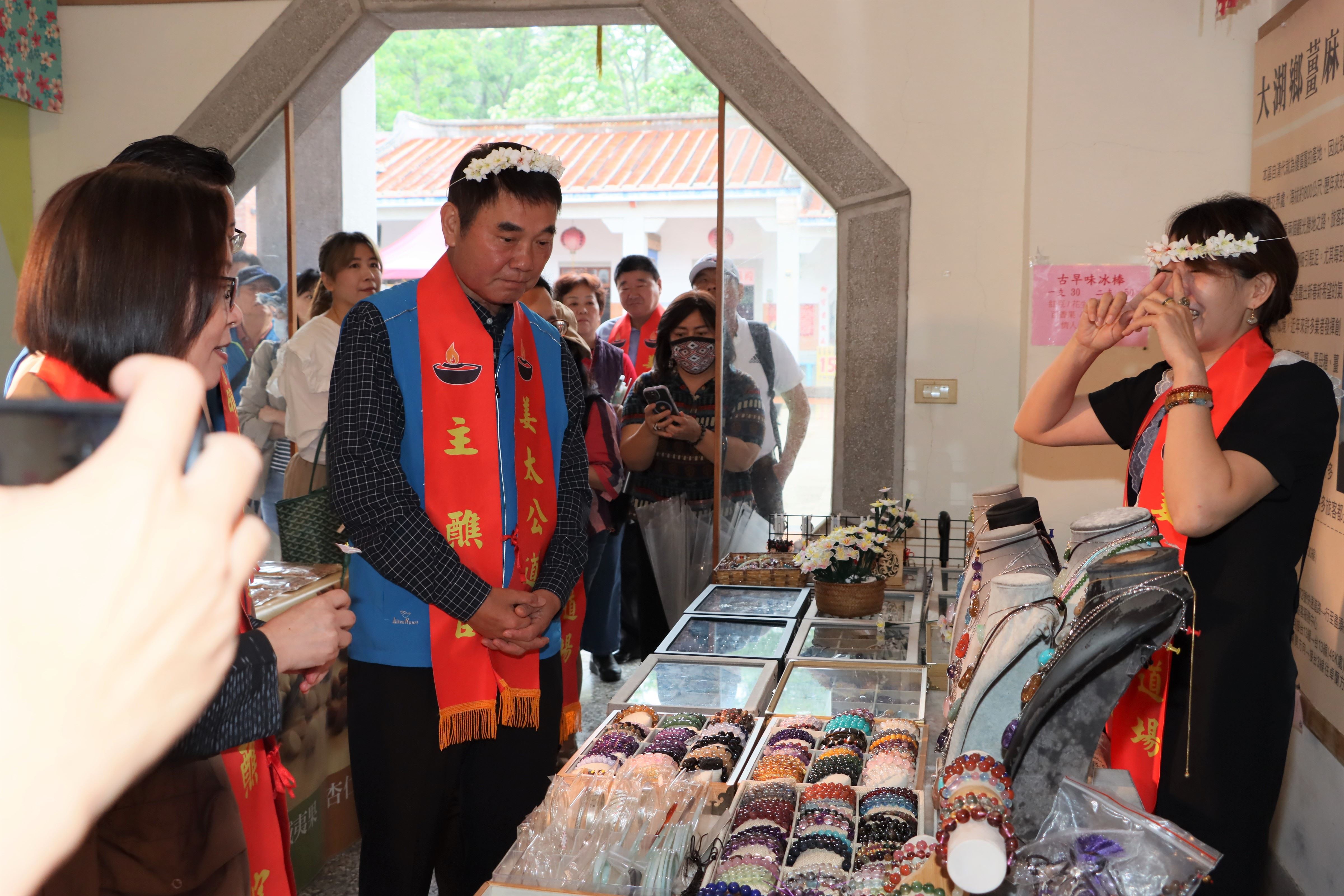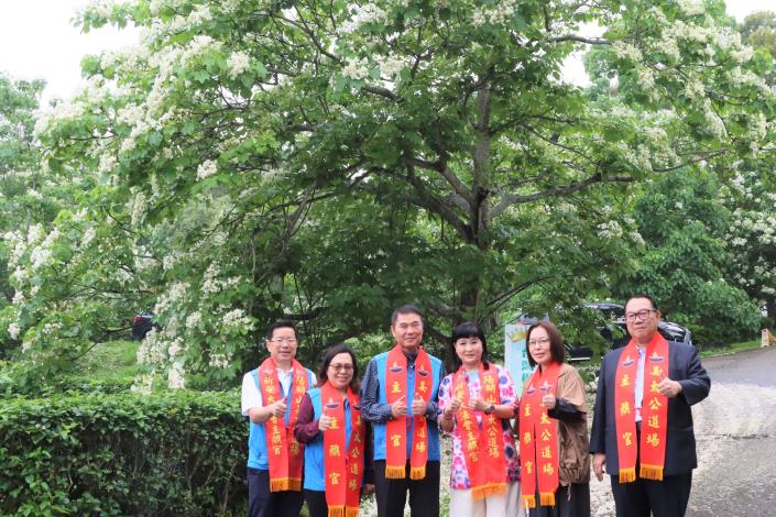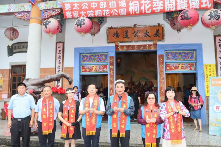 為迎接今年桐花季,道場精心推出「伯公仔桐花嘉年華」,遊客除賞桐,還可參拜兩百年歷史的土地公祈福,並享用新住民販售的世界各地美食小吃。苗栗縣長鍾東錦與文觀局長林彥甫及原民處長盧曉鈴今(28)日赴客家大院推廣桐花季,並為新住民攤商加油打氣,一起為苗栗拚經濟!