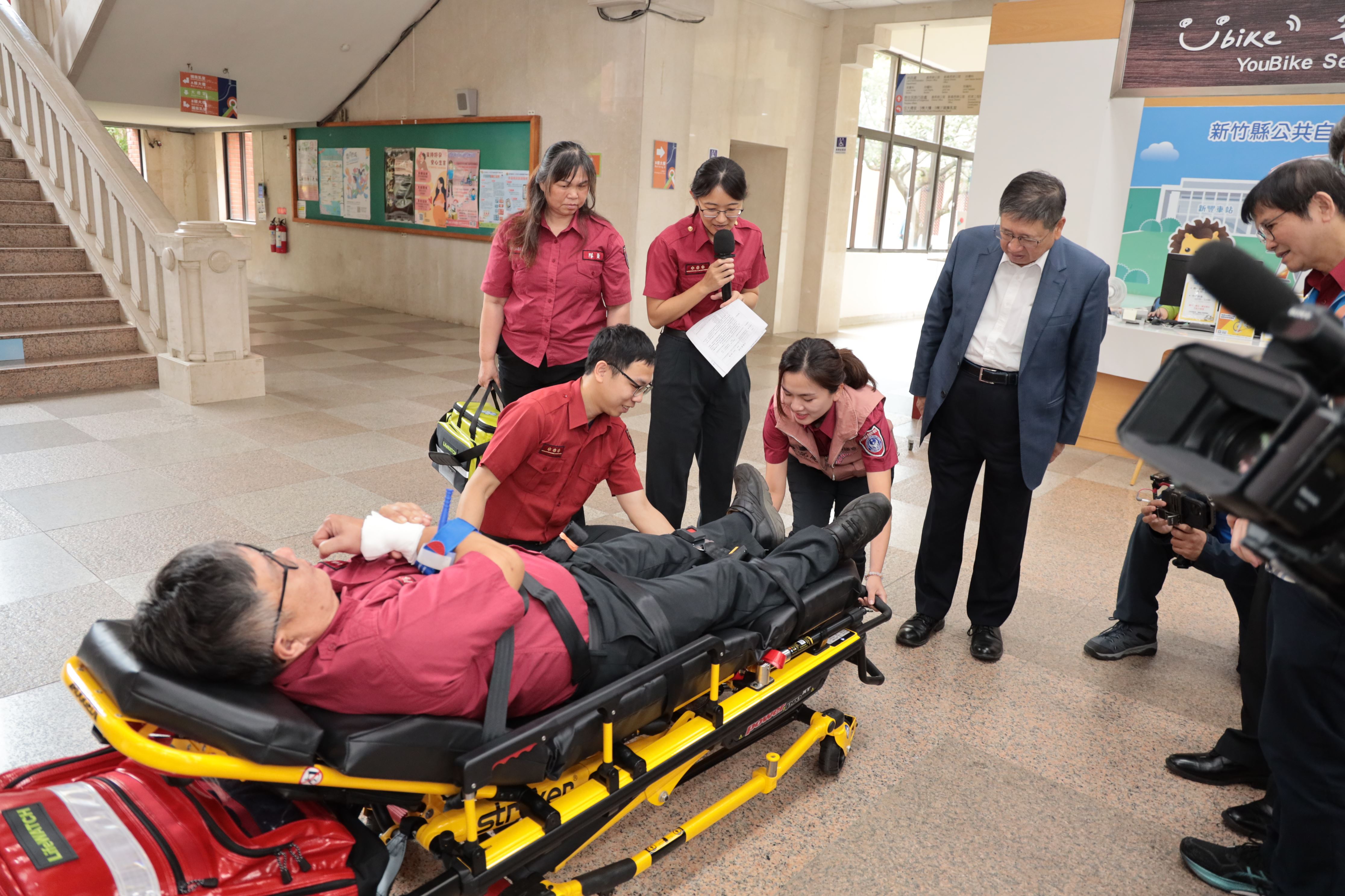 除標準救護裝備外,救護車亦升級多項急救設備,包括兒童用擔架床固定裝置組、成人與兒童用骨盆固定器,以及戰術止血帶等,強化應對多元緊急狀況的能力。新埔分隊消防同仁於捐贈典禮上也進行模擬車禍大量失血救護演練,展現15秒內快速固定止血帶的實力,並實際操作電動擔架床,驗證新設備對提升救護效率與保護消防員的重要助益。