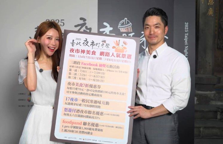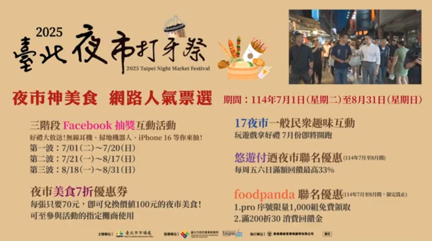 並向外界宣布「2025臺北夜市打牙祭」除了原有之紙本7折優惠券外,也與電子支付平台悠遊付合作,提供累積最高33%回饋,並媒合知名外送平台foodpanda提供消費折抵金等精彩內容,歡迎廣大市民朋友與海內外觀光客於暑假期間前往臺北市各大夜市消費,感受臺北市多元的在地文化特色。