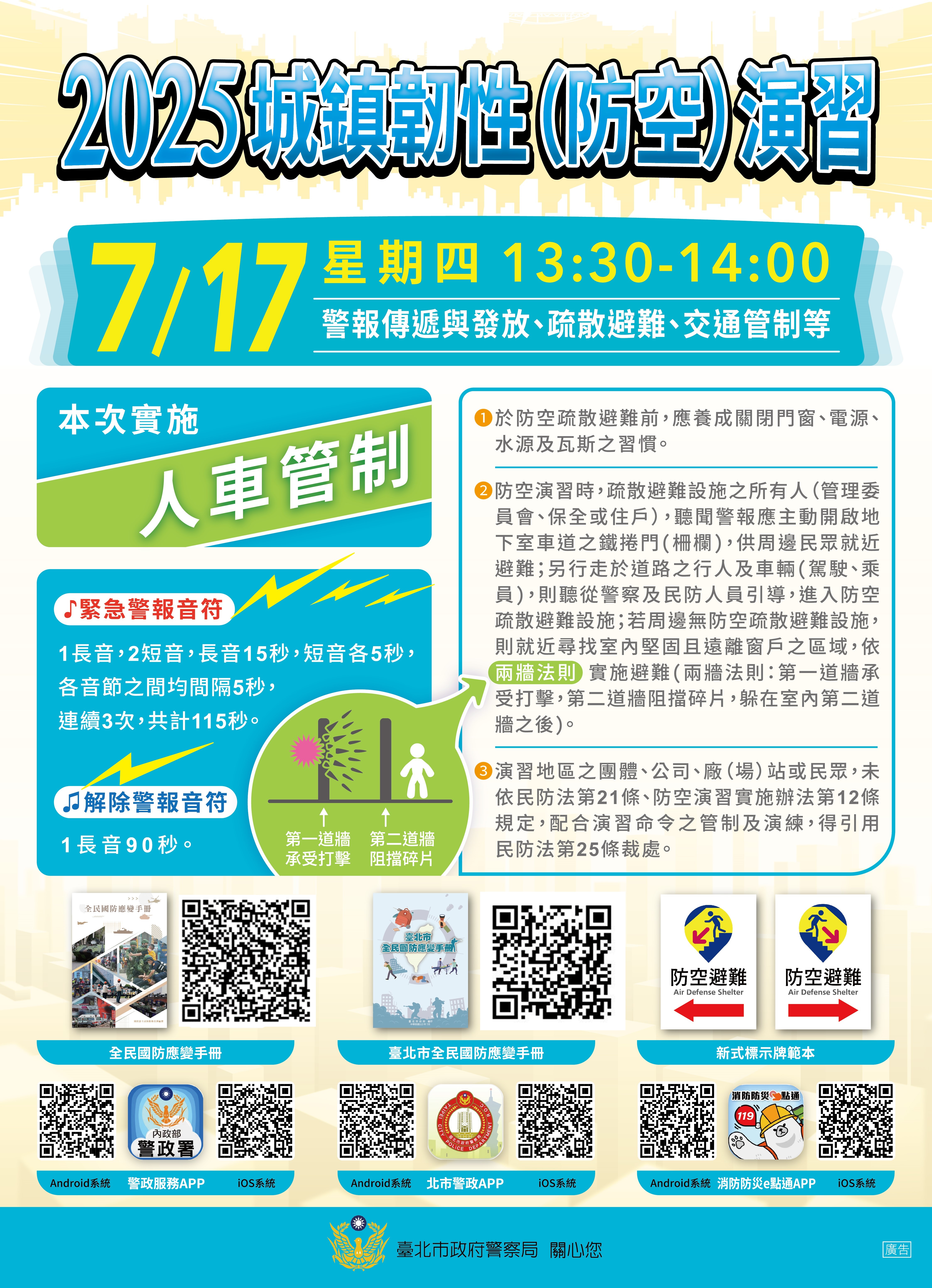 臺北市政府觀光傳播局說明, 114年7月17日下午1時30分至2時將實施30分鐘的城鎮韌 性防空演習,當天將發放1長音、2短音的警報聲,並重複3次, 屆時全市人、車及各場所將進行疏散避難、 交通及其他必要管制等實作演練,所有民眾或旅客於聽聞防空警報( 或接獲手機告警訊息)時,應依警察及民防執勤人員引導, 就近實施疏散避難。