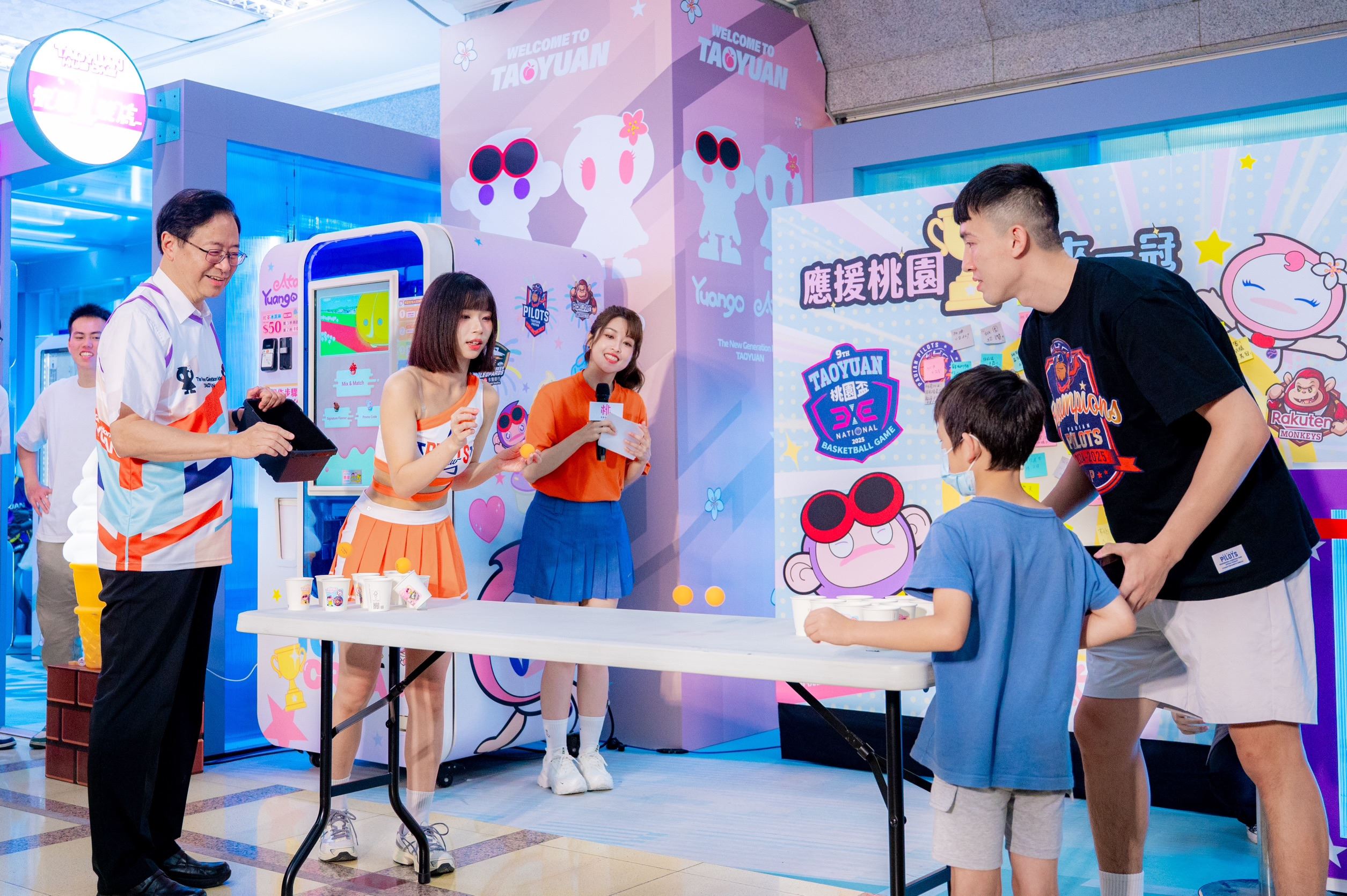 今日張市長與桃園璞園領航猿球星白曜誠及Pilots Crew啦啦隊女孩Ruka,於活動現場和市民朋友一同挑戰「投杯乒乓」及「彈瓶蓋」遊戲,現場氣氛熱絡,觀賽民眾亦熱情高呼「再來一冠」,串聯球迷情感與運動精神,展現桃園智慧生活結合體育城市的創新與活力。