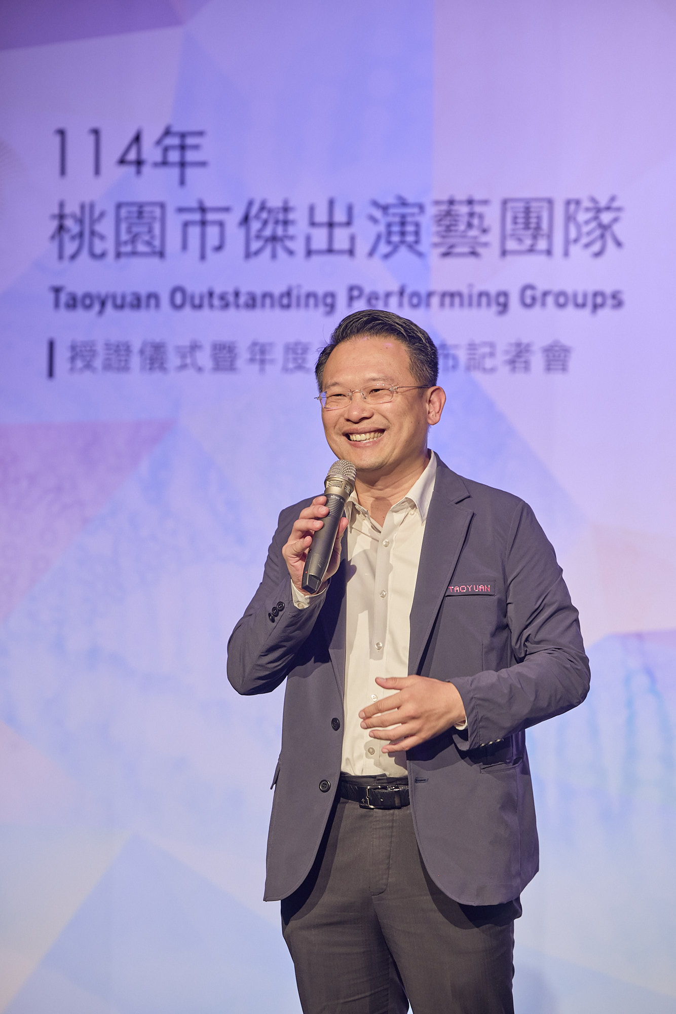 桃園市副市長蘇俊賓今日前往桃園區米倉劇場參加「114年桃園傑出演藝團隊授證典禮」,蘇副市長表示,今年桃園共選拔出12個優秀的演藝團隊,領域涵括音樂類、戲劇類、舞蹈類及傳統戲曲類,這些傑出團隊不斷持續成長而且自帶流量、擁有忠實觀眾,並持續在舞台上發光發熱,這樣的能量實屬難能可貴,而桃園不僅要持續發掘精彩的表演團體,市府也會持續打造好的藝術舞台及環境,讓桃園的文化能量得以持續豐沛發展。