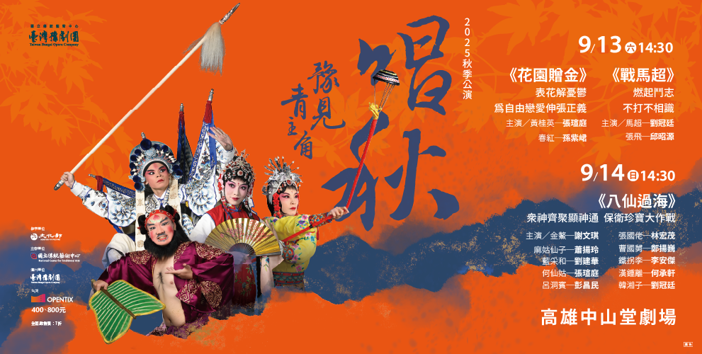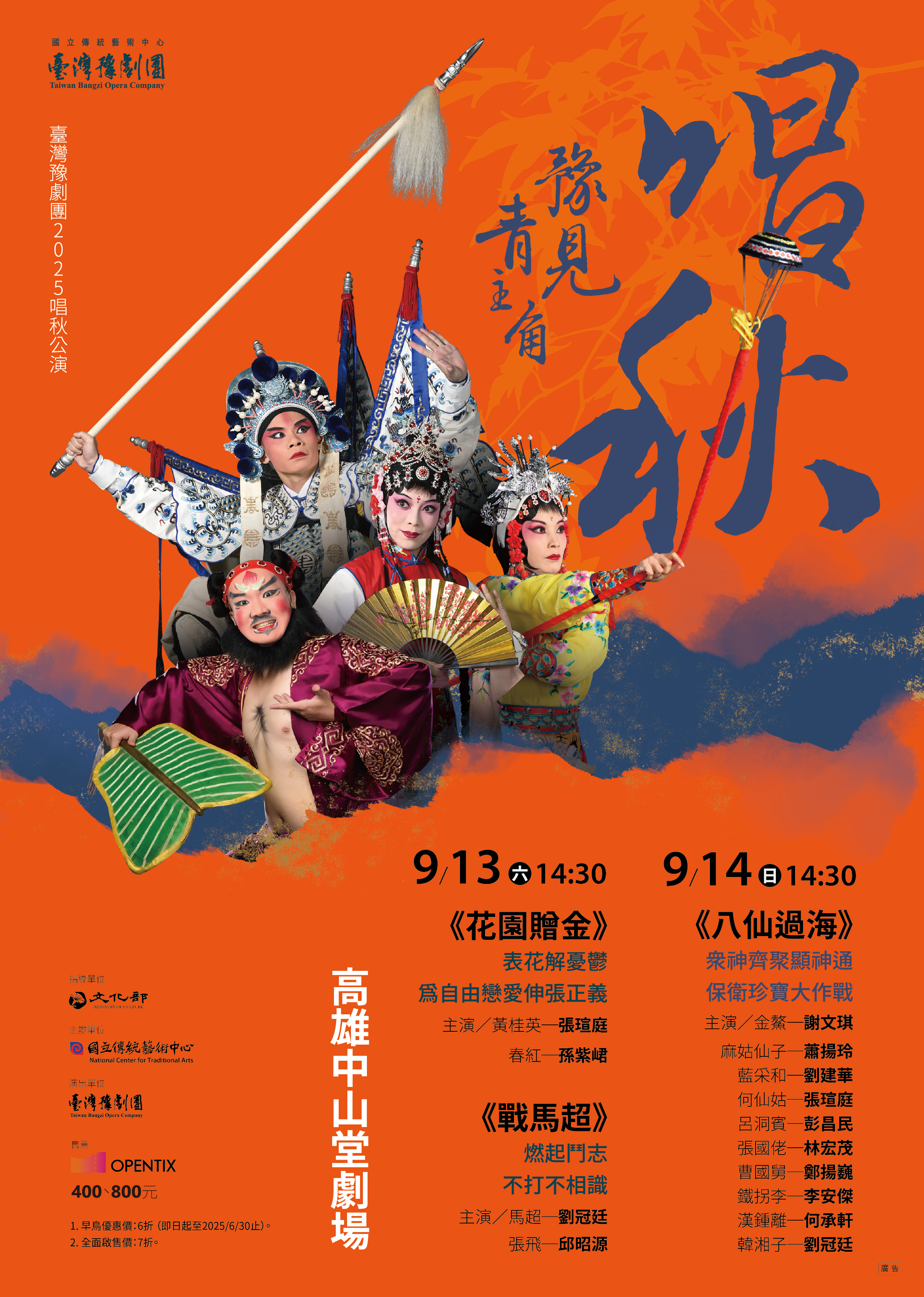臺灣豫劇團「唱秋公演」將於2025年9月13日、14日在高雄中山堂劇場重磅上演,購票請上網OPENTIX系統、私訊「臺灣豫劇團」臉書粉絲專頁,或電洽07-5828753轉53。