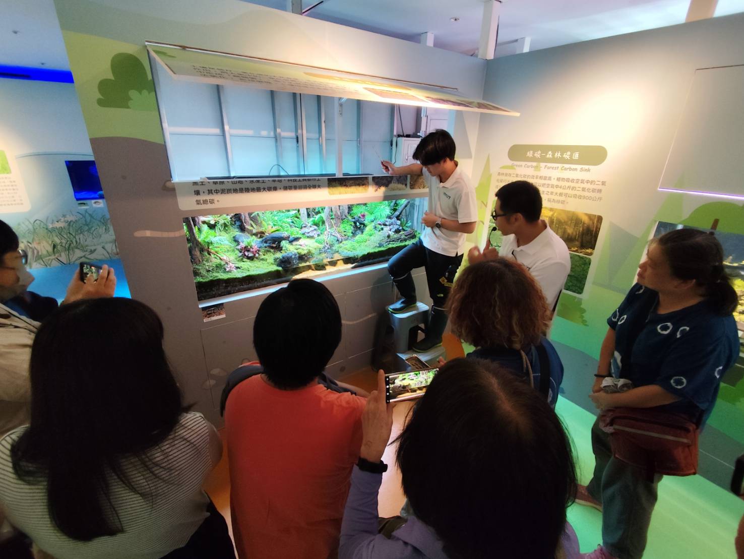 海科館說明本次特展設計三大主題亮點,在「自然碳匯」展區以藍碳(紅樹林、海草床、鹽沼)、綠碳(森林)與黃碳(土壤)多元色彩出發,介紹各類生態系在全球碳循環中的要角及其彼此間的深刻聯繫。