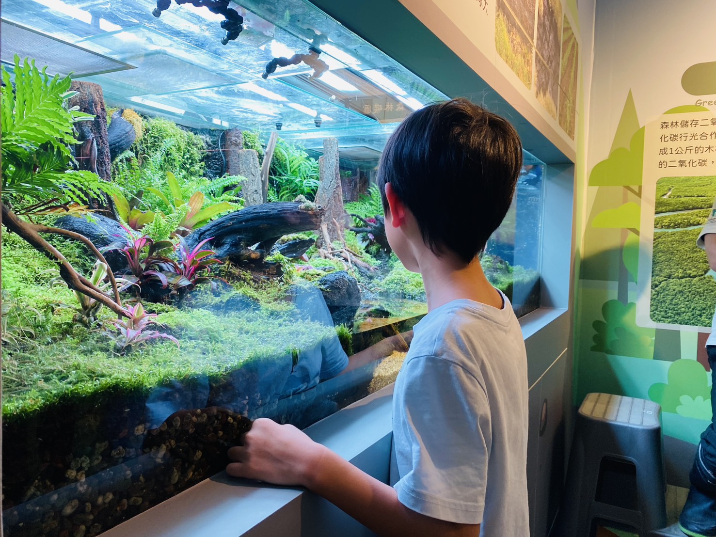 小朋友專注觀察特展中的綠碳(森林)展區,認識陸地生態系在碳循環中的重要性