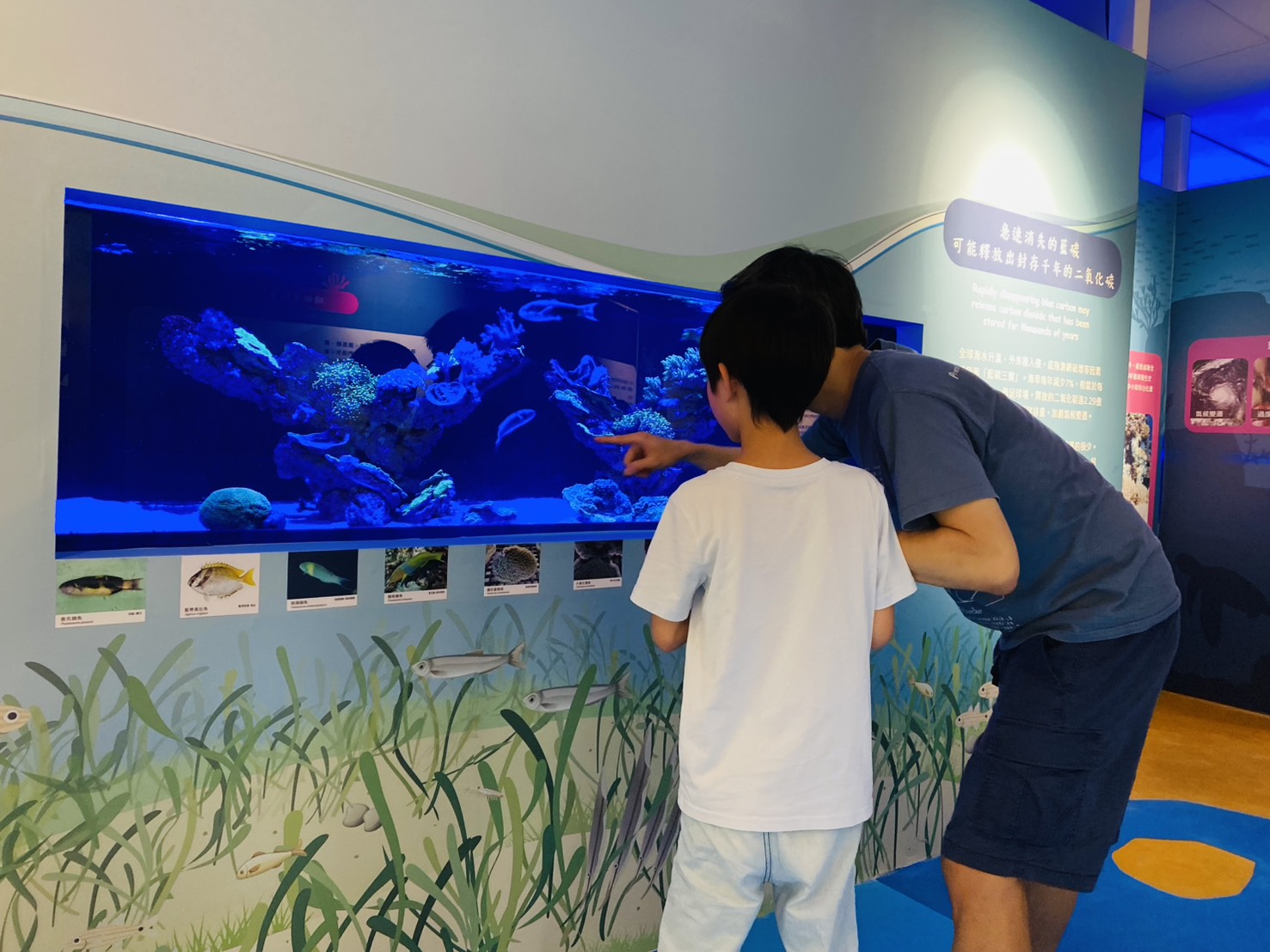 客在展區內觀賞海洋生物,透過生物展示啟發對海洋的興趣.