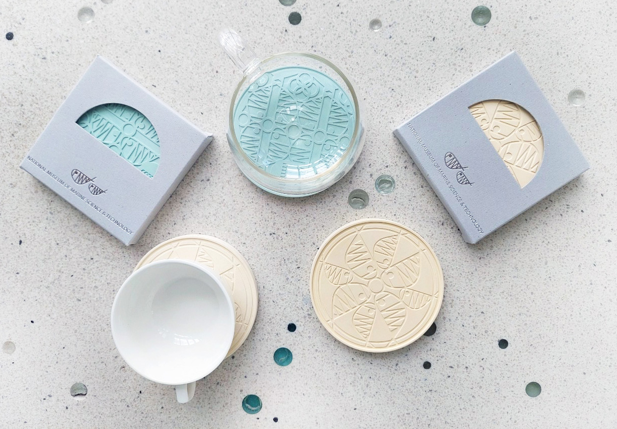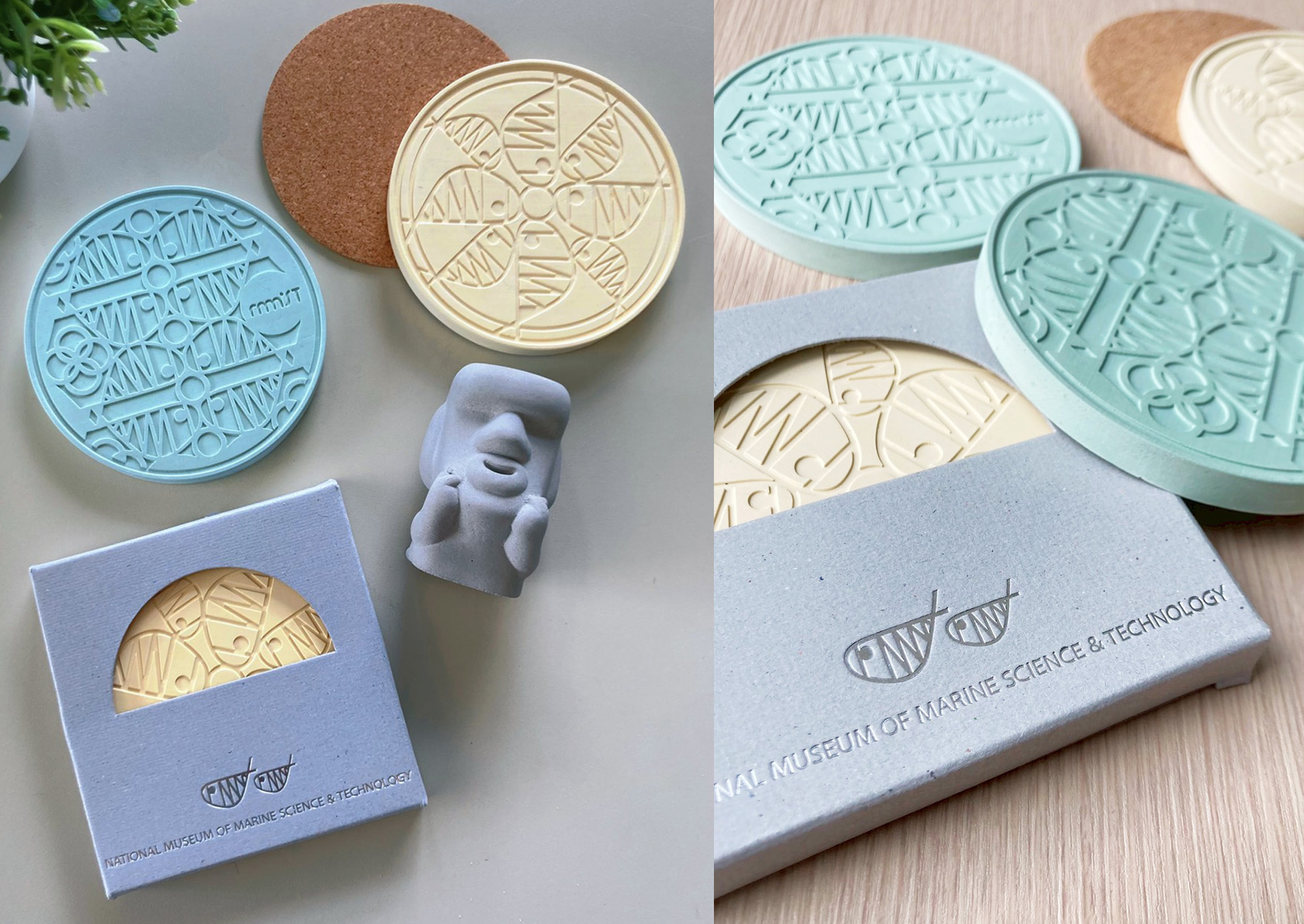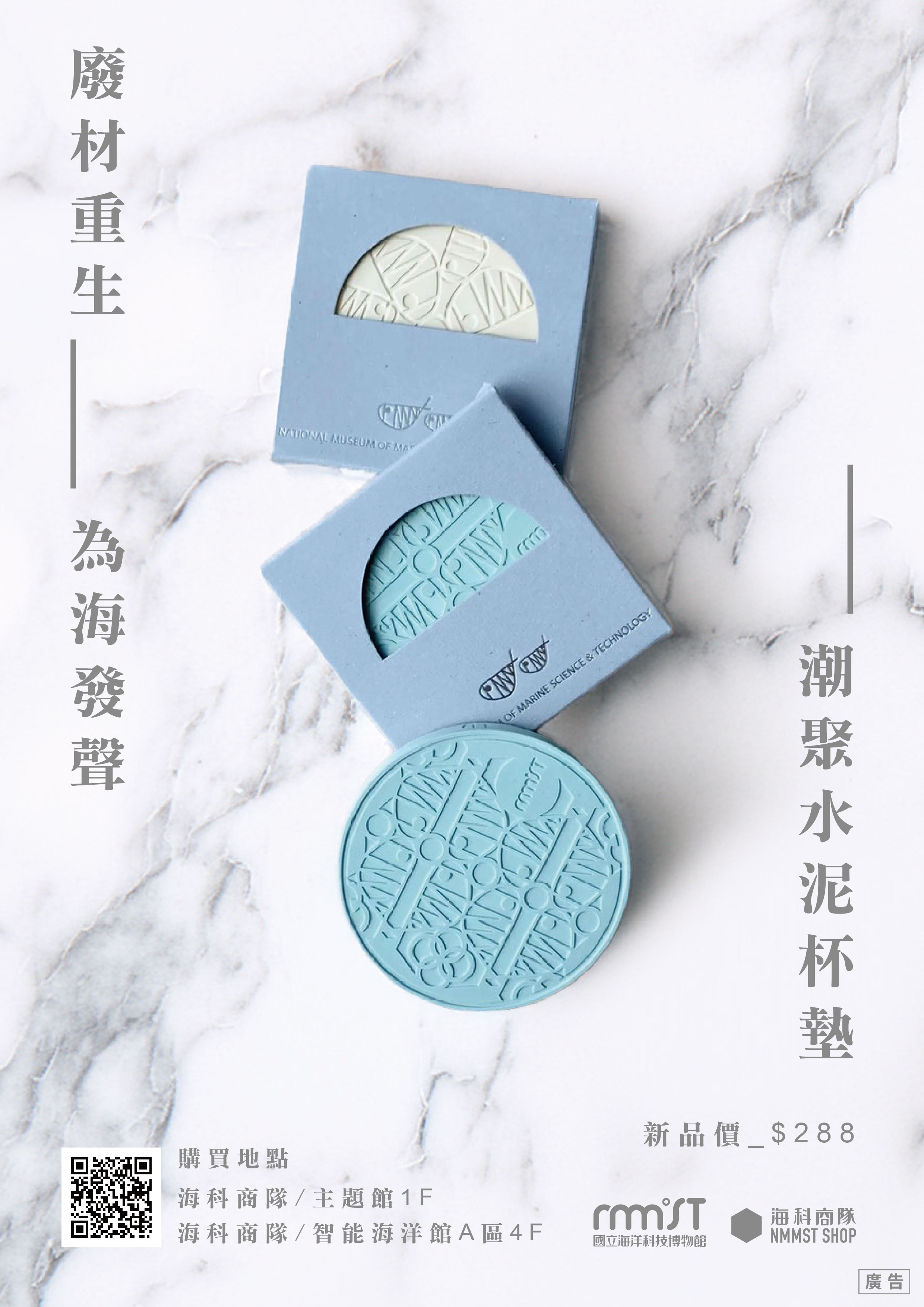 國立海洋科技博物館繼以環境和資源永續成功打造的文創商品「掃巴救星-擴香石」獲得肯定與商品迴響後,近期再度以創新文創及實踐永續海洋精神,特以廢棄建材回收再製的環保水泥,推出全新商品—「潮聚水泥杯墊」,這款吸水的水泥杯墊一推出即吸引許多關注和收藏者喜愛,不但具有日常生活實用價值,也能呼應環境永續和守護海洋的行動。