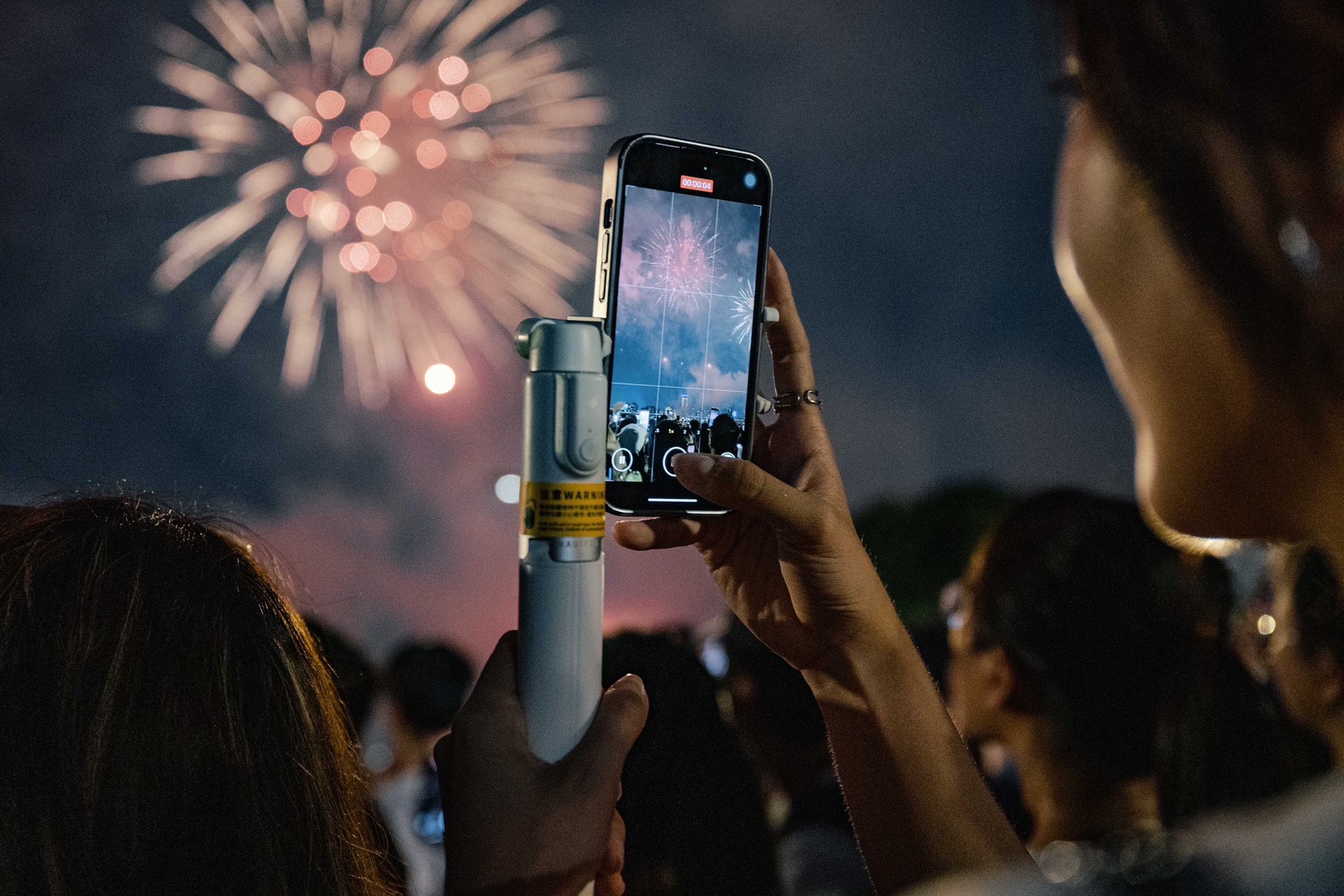 300秒主題煙火綻放照亮夜空,吸引眾多民眾拍照留念. 圖/臺北市政府觀傳局提供