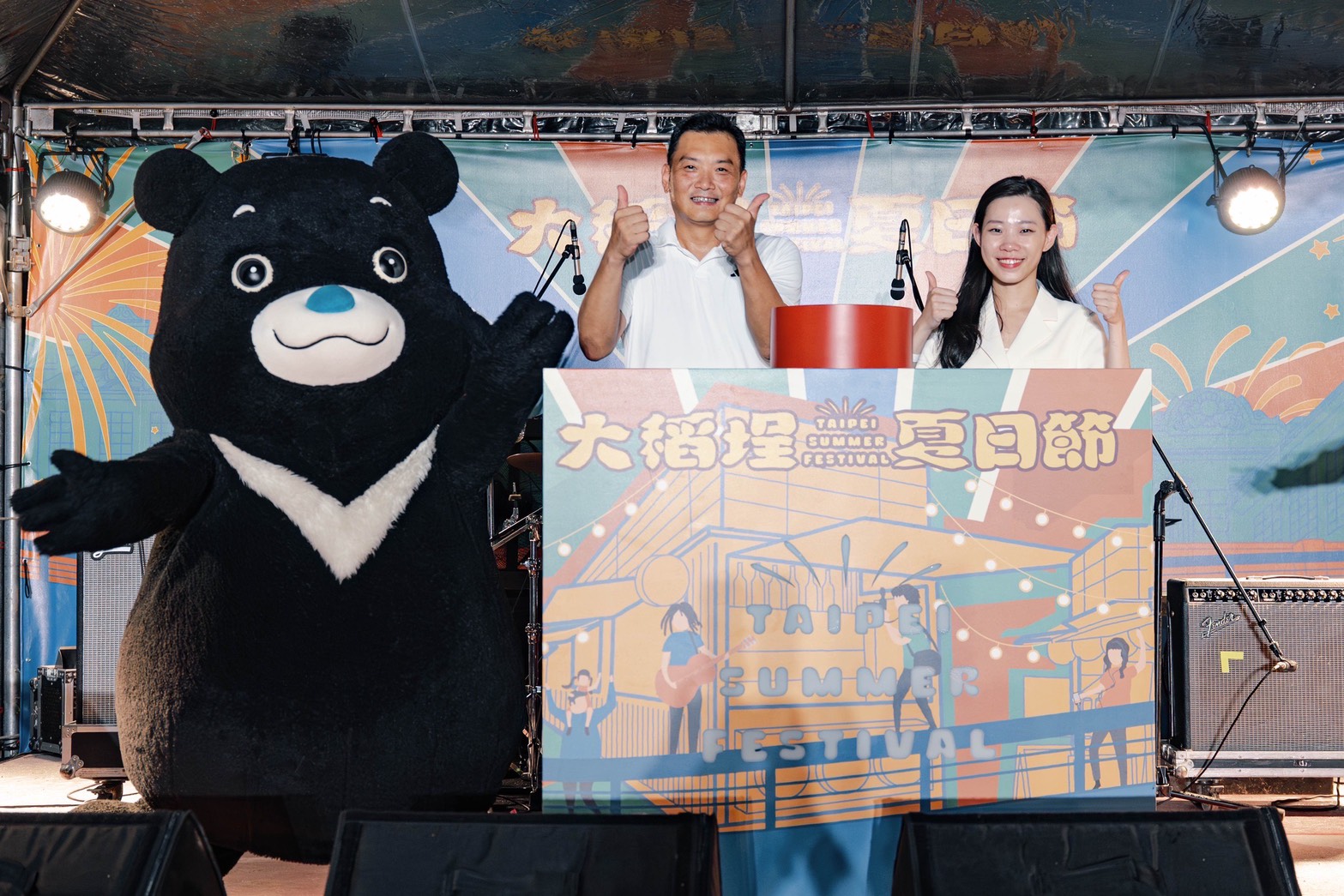 首場大稻埕夏日節由臺北市政府俞振華副秘書長、觀傳局余祥局長及臺北市吉祥物熊讚一起啟動煙火秀 圖/臺北市政府觀傳局提供