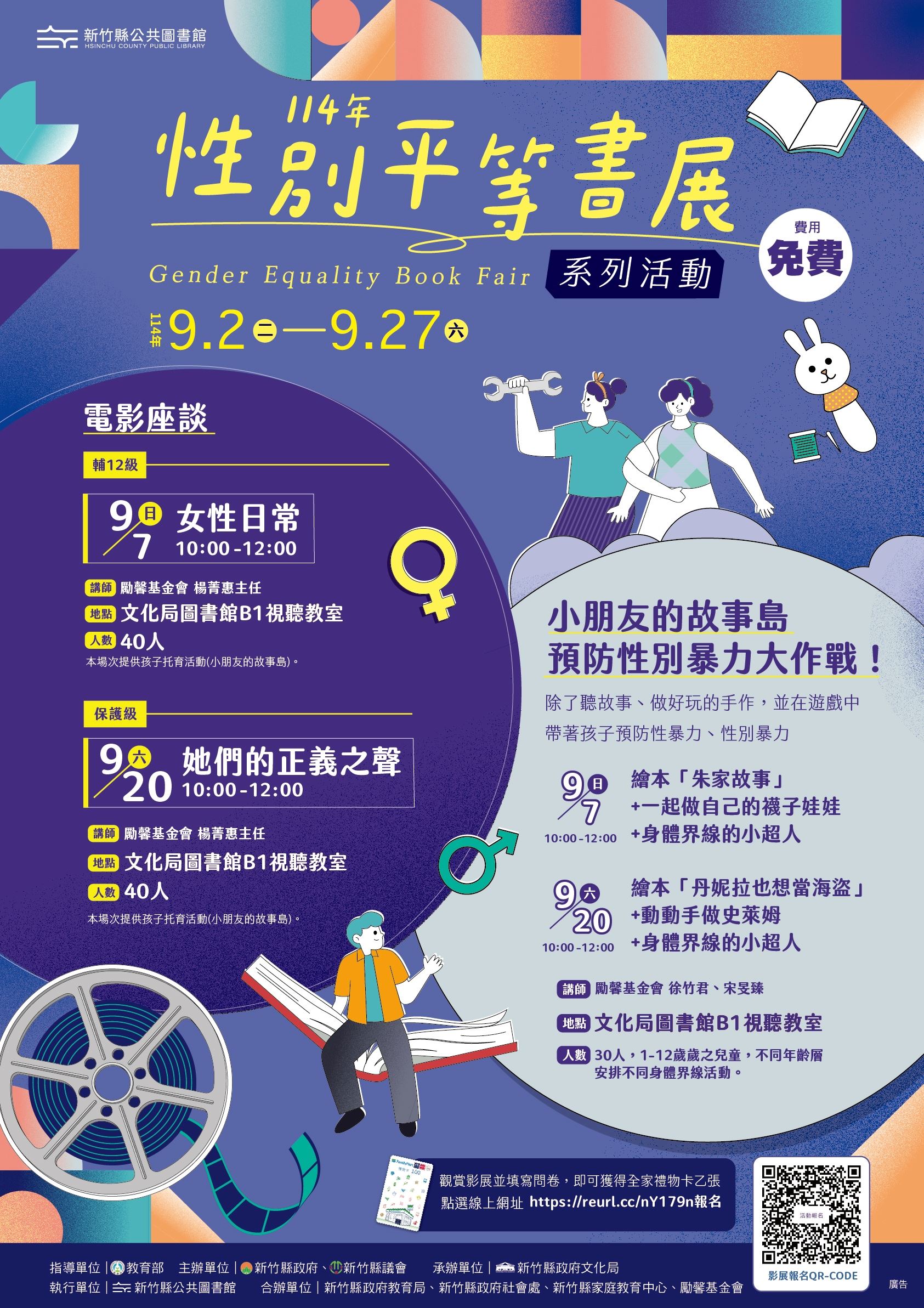 響應性別平等政策,新竹縣政府跨局處攜手勵馨基金會,9月起於文化局圖書館推出性別平等主題書展系列活動,除了能聽故事、看好書,還有電影座談會及繪本教育手作活動,期盼透過寓教於樂的方式,讓大小朋友看見不同的生命故事,學習尊重與包容,讓性平觀念從小扎根。