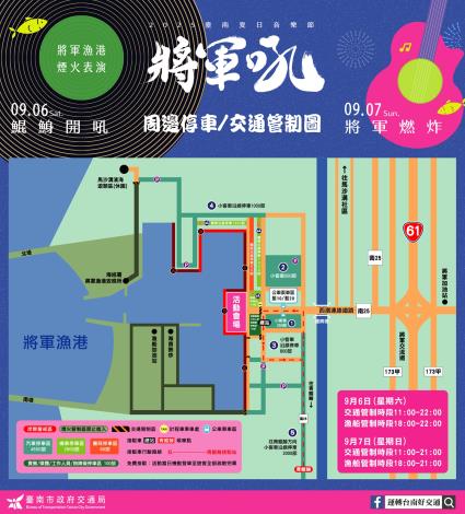 觀旅局提醒,活動兩天將軍漁港聯外道路將實施交通管制,鼓勵民眾可多利用大眾運輸工具前往,亦可預約活動合作的台灣大車隊接駁服務(電話06-2450496)。