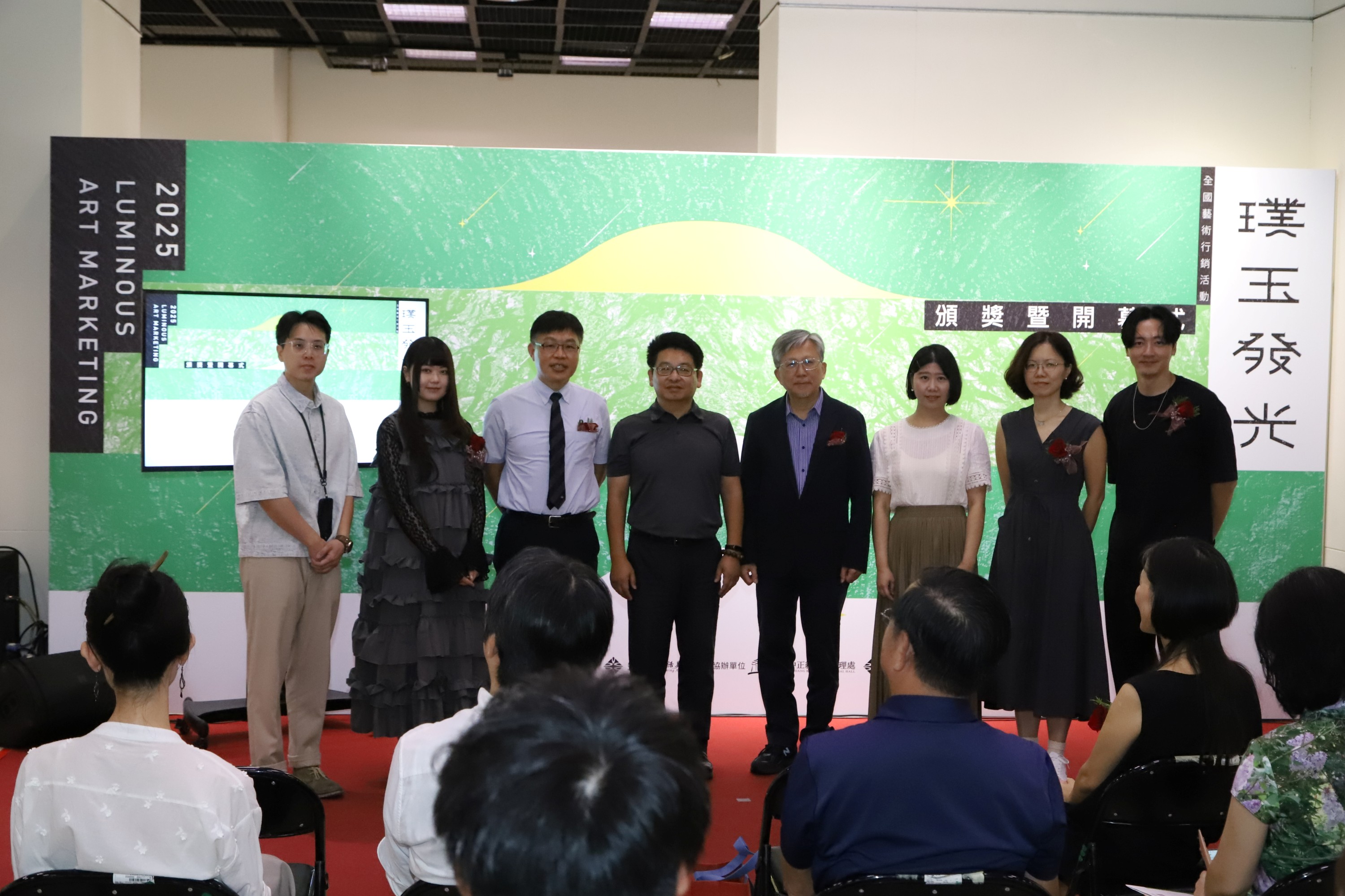 璞玉獎五位得獎者與玄奘大學簡紹琦校長(左3)、國立新竹生活美學館葉于正館長(左4)及前國立臺灣美術館廖仁義館長(左5)合影. 圖/國立新竹生活美學館 提供