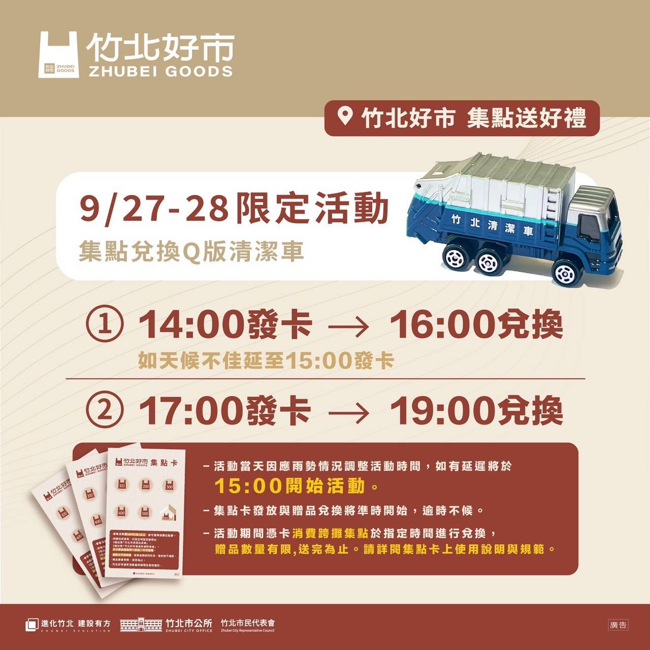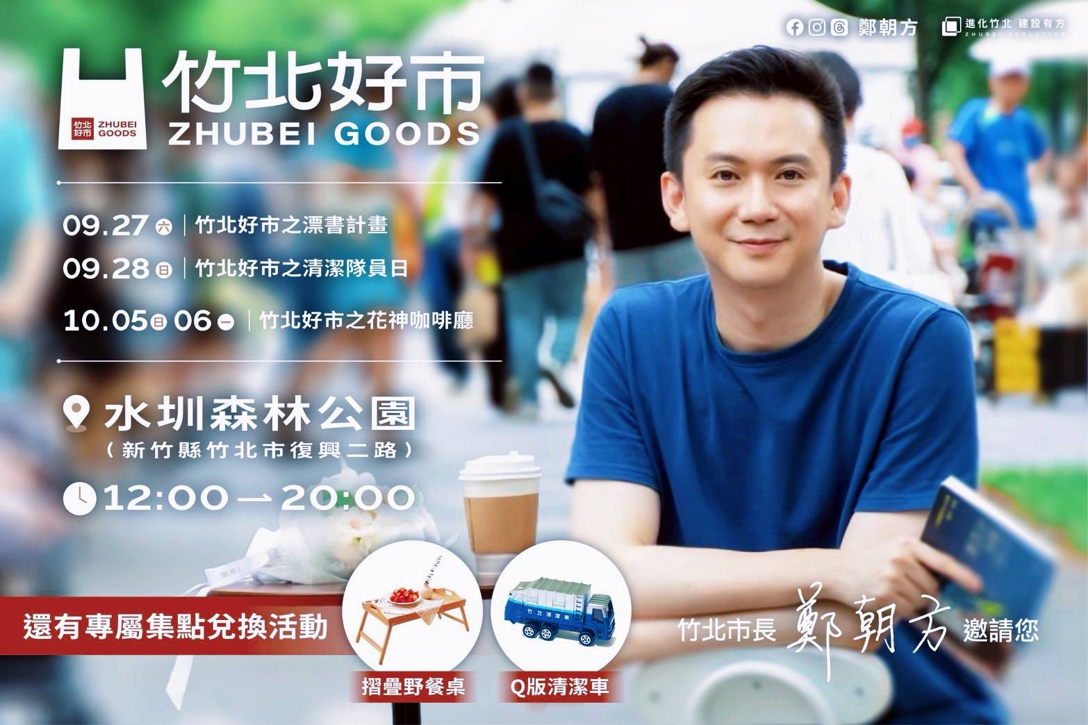 市長鄭朝方表示,竹北除了專注於建設發展,更重視市民的生活質感。這次「竹北好市」特別規劃主題活動:9月27日由竹北市立圖書館推出「漂書天」,讓民眾消費即可換書,把知識與閱讀樂趣帶回家;28日以「清潔隊員日」為主題,向城市英雄致敬,並設有小小清潔英雄體驗,現場還能看到原型清潔車與如變形金剛般的新型水車霸氣站台。