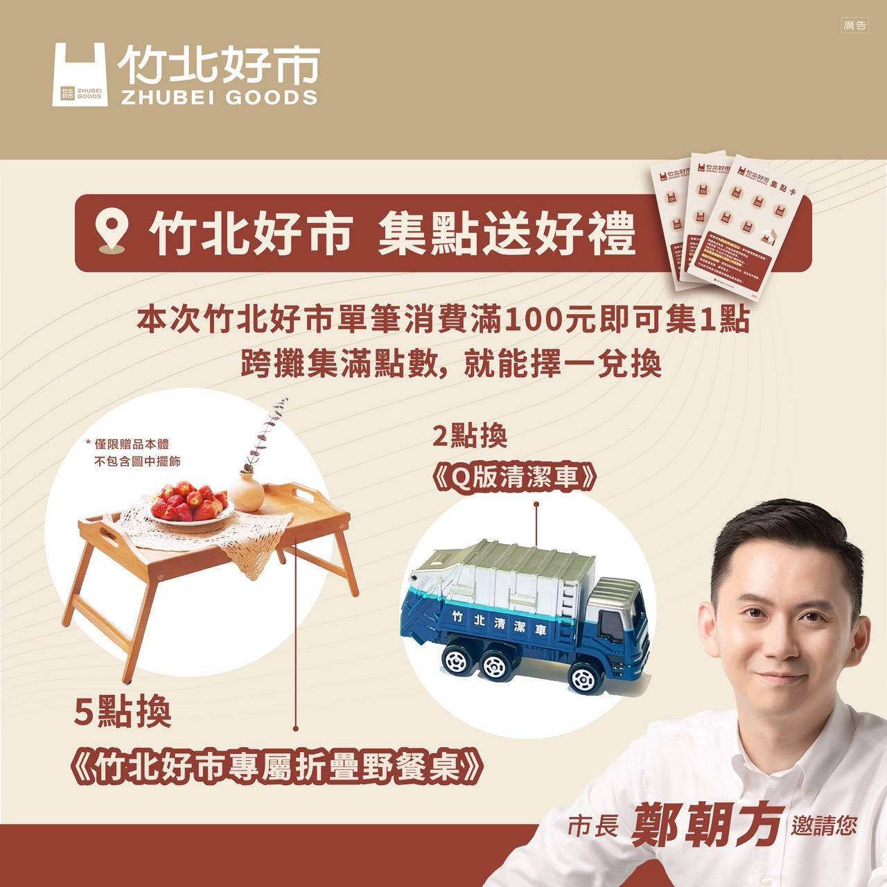 其中,特別安排的「圓夢舞台」優先開放給竹北市民,讓鋼琴愛好者能在舞台上實現音樂夢想,展現自我風采。 市公所也推出「集點兌換活動」,民眾可至服務台領取限定集點卡,分為野餐木桌及敲碗已久的Q版清潔車,每人限領一張),於市集消費滿百即可獲得一點,集滿五間不同攤位點數即可兌換每日限量50份的「竹北好市專屬摺疊野餐桌」,四日都有。此外,9月27日至28日更推出限量加碼活動,集滿兩點即可兌換每日100台的「Q版竹北市清潔車」。 活動期間更有多重驚喜:消費滿150元即可獲漂書券一張,可兌換三本書;咖啡攤位消費則能獲得霜淇淋券,數量有限送完為止。