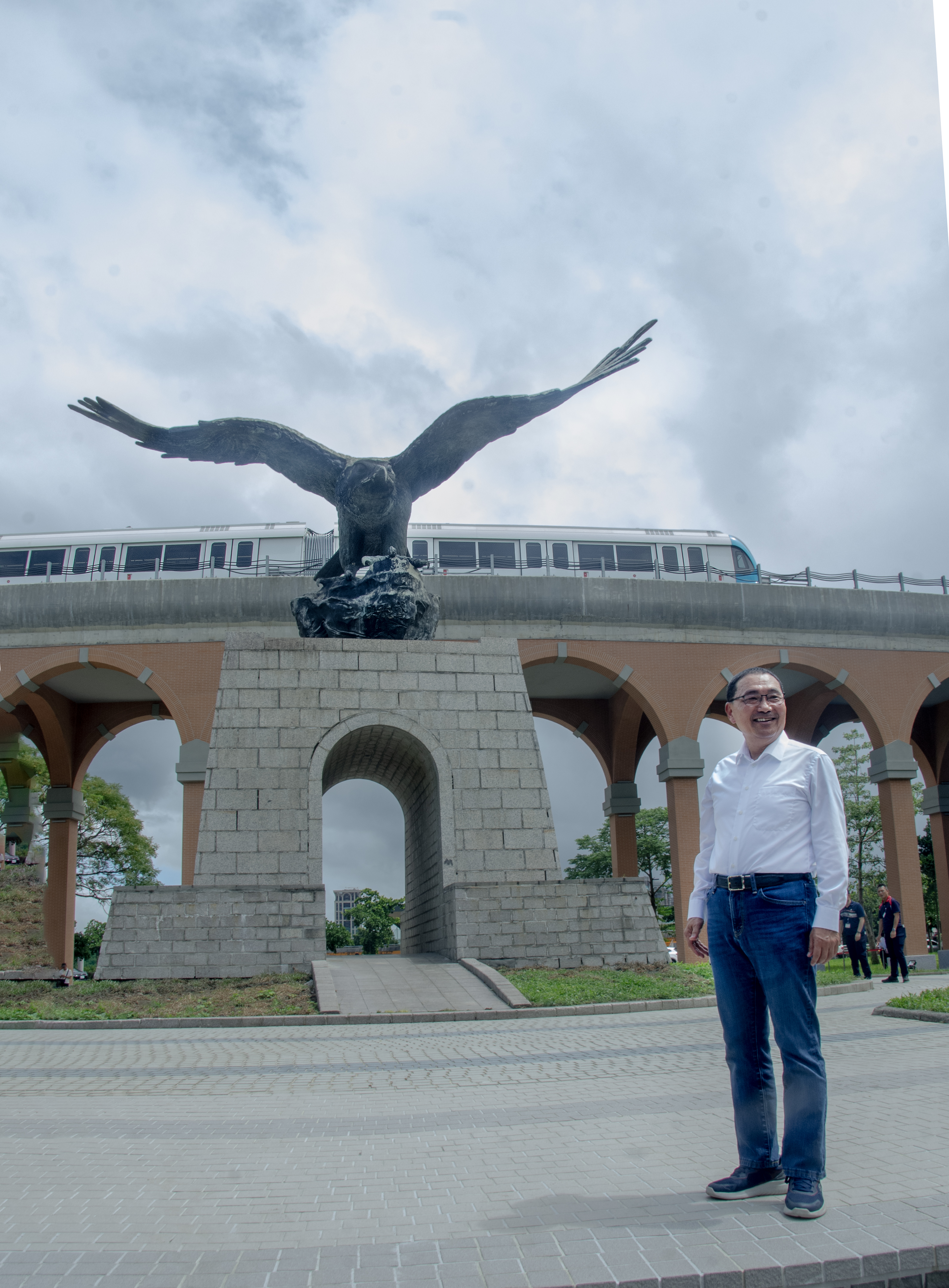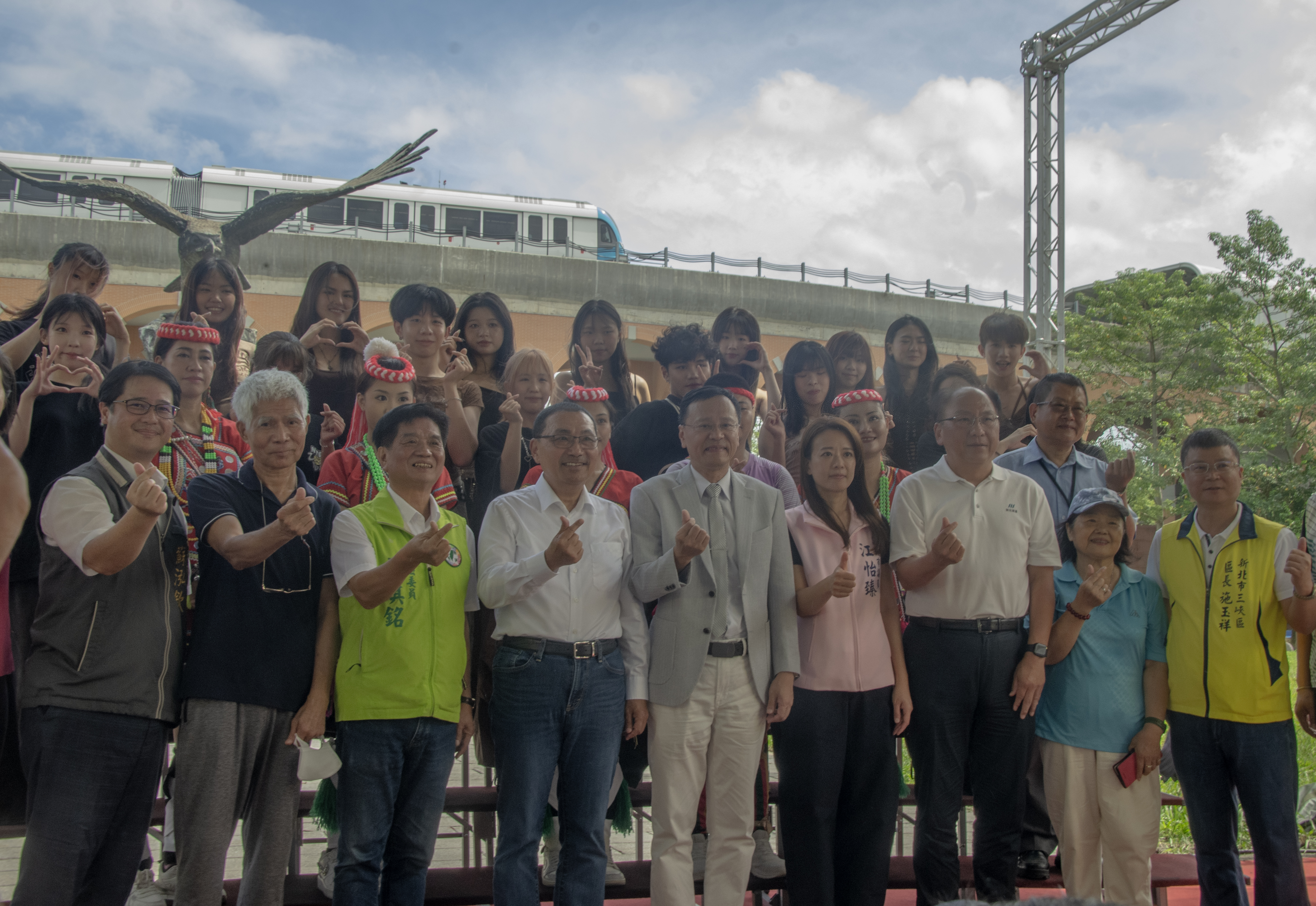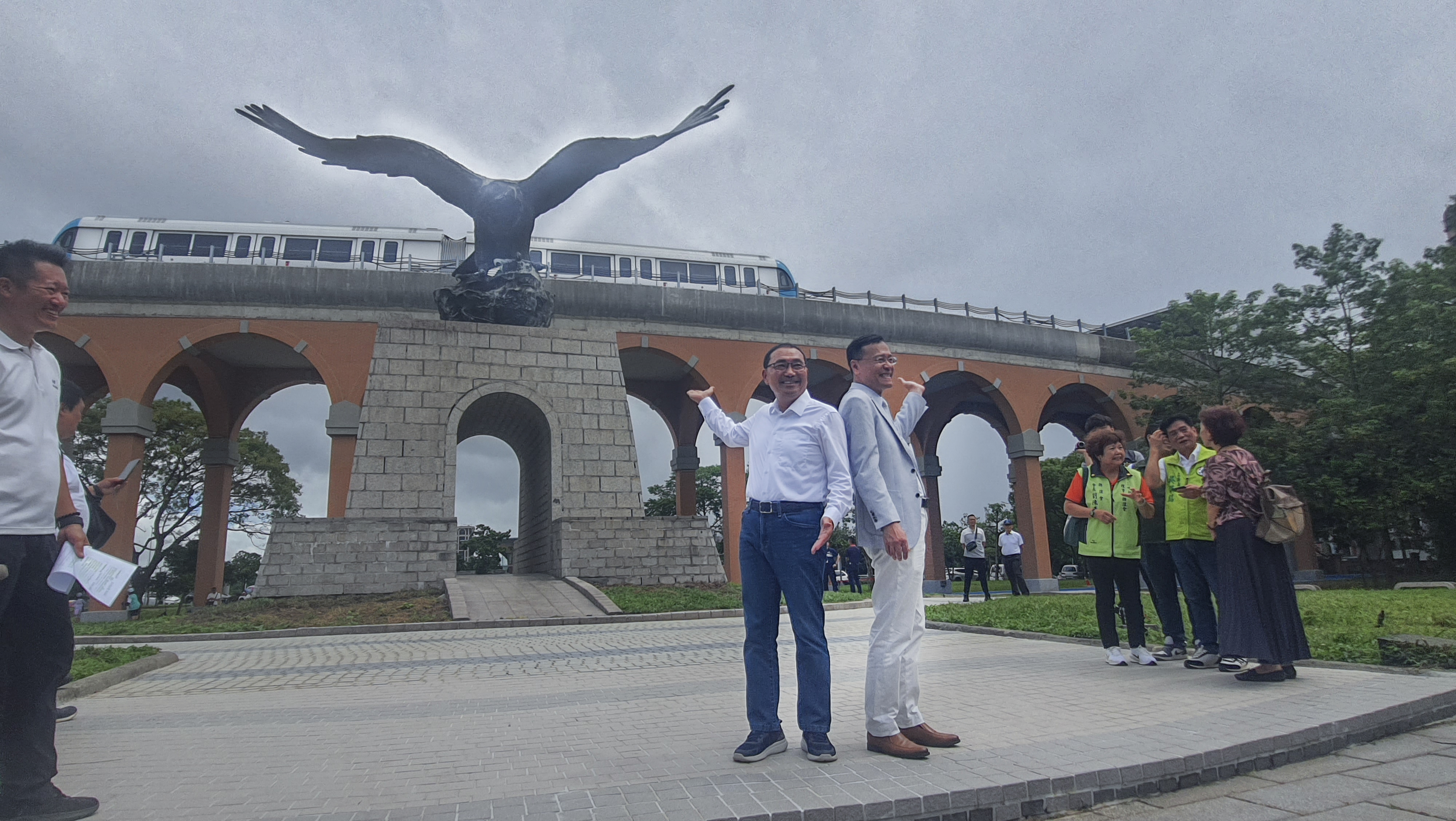 侯友宜感謝國立臺北大學與市府合作翻新飛鳶廣場,具現代感的藍色捷運列車,搭配古典的仿紅磚拱橋及象徵北大校園精神的飛鳶銅像,別有意象!相信未來飛鳶廣場不僅是北大學生們拍攝畢業照的地點,也將成為遊客打卡、婚紗攝影的新地標。