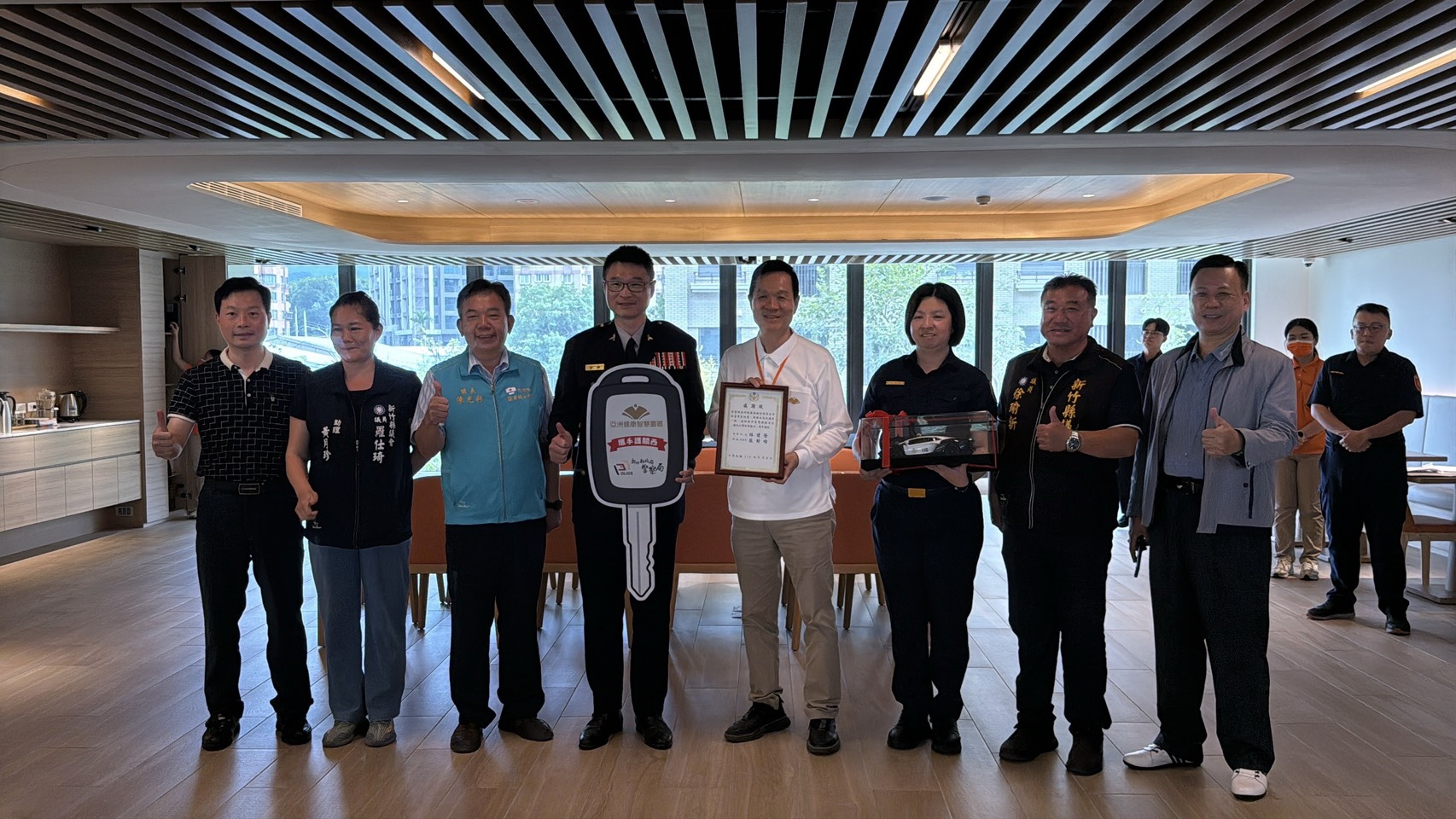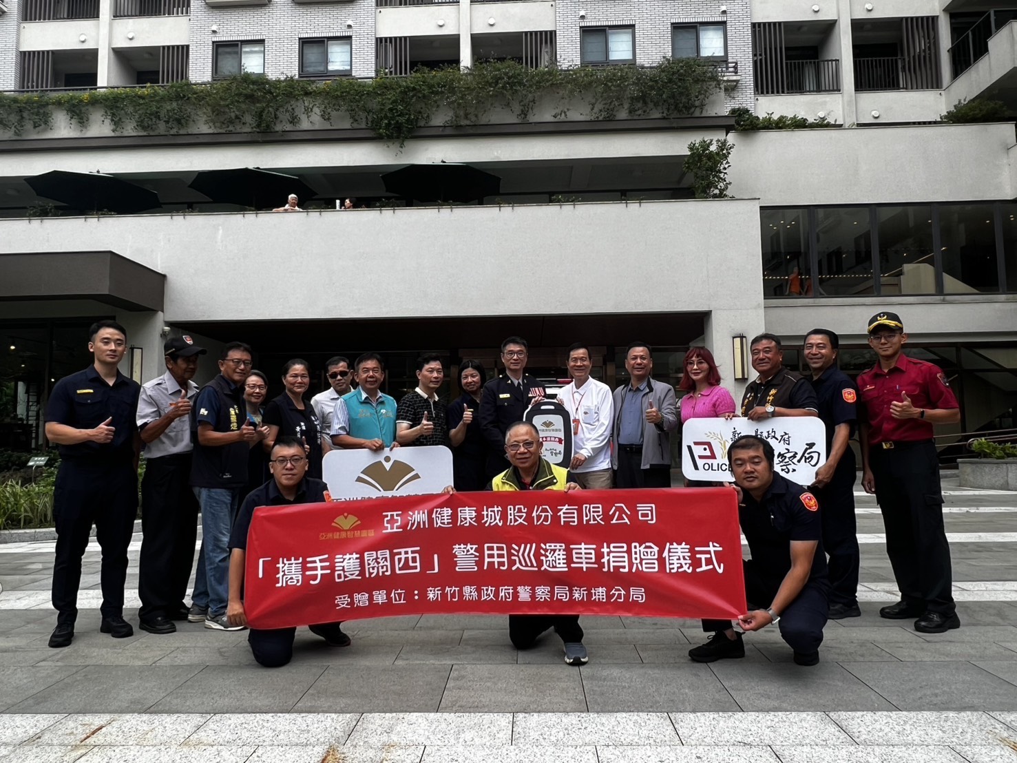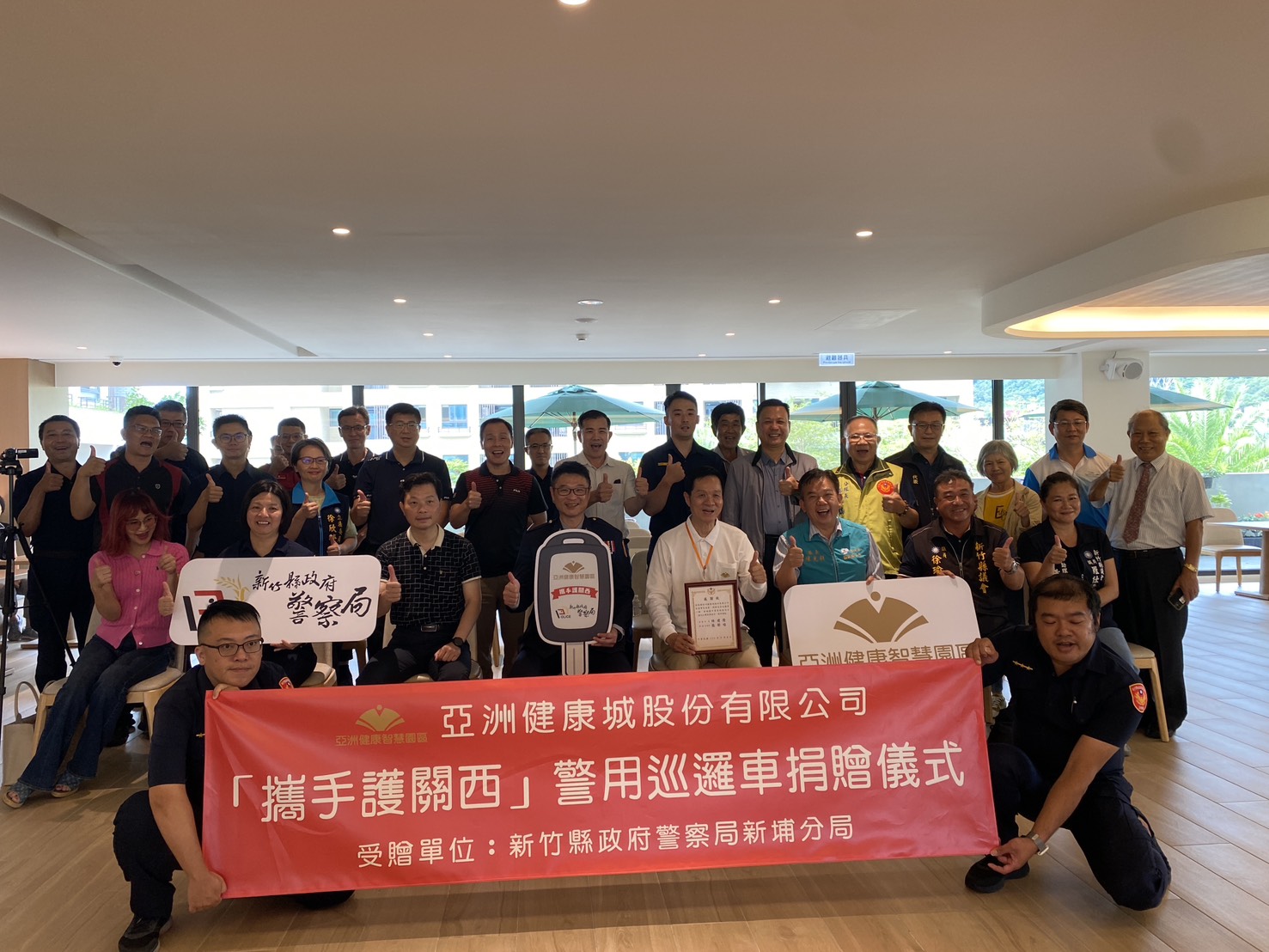 捐贈典禮在關西鎮亞洲健康智慧園區舉行,由亞洲健康城董事長彭培業主持,警察局長林建隆、新埔分局長張舒喻代表受贈,警察局及新埔分局各重要幹部與地方首長、各級民意代表及在地仕紳、義警、民防、巡守隊各協勤民力幹部皆到場見證,共同感受企業回饋鄉里的溫暖情誼。