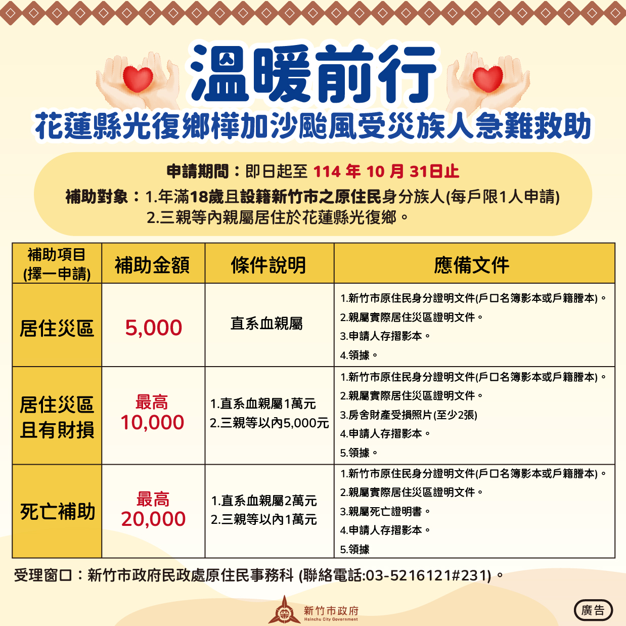為協助旅居新竹市的原住民族受災家庭,減輕其經濟壓力並確保能獲得及時救助,新竹市政府啟動「樺加沙颱風受災族人急難救助計畫」,每戶可領萬元津貼,即日起開放申請,受理至114年10月31日止。