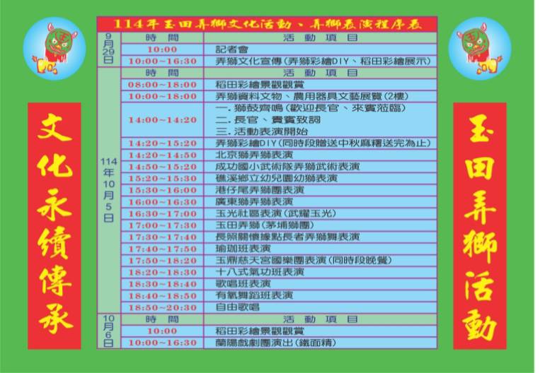 宜蘭縣礁溪鄉玉田社區發展協會訂於114年9月29日(星期一)上午10時在玉田社區活動中心(玉田玉鼎慈天宮)舉辦「『114年礁溪玉田弄獅系列活動』記者會」,有獅座彩繪DIY展示及稻田彩繪景觀觀賞,