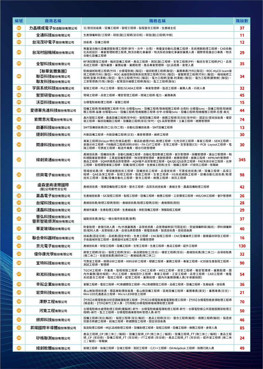 本次徵才活動集結力積電、宜特科技、京元電子、欣興電子、緯創資通、頎邦科技、昇陽國際半導體、矽格聯測、全智科技、啟碁科技、宏齊科技等共35家科技業者;隨著iPhone 17熱銷,帶動供應鏈人才需求,蘋果重要供應商之一的欣興電子,本次徵求多達98名工程師及技術員,其中IIS系統網路工程師與資訊工程師職缺,薪資上看80K,吸引高階人才目光。此外,昇陽國際半導體也積極徵才,釋出60個職缺,包括製造助理工程師、MQC品檢助理工程師、設備助理工程師、廠務工程師及倉管人員等,歡迎無經驗者應徵,錄取後提供完整培訓並有機會調薪,展現企業育才與留才的決心,歡迎社會新鮮人或希望跨足科技業的轉職者,把握機會前往面試選擇適合職缺! 本場活動除就業媒合外,特別為新鮮人規劃「面試・上班必備妝容」就業準備課程。考量青年面試經驗較少,常因妝容與儀態不夠自信、專業,影響面試表現與錄取機會,此次特別邀請專業求職彩妝師小T老師,現場示範簡易修容與妝容技巧,協助青年在面試中展現專業形象與親和力,提升錄取率。免費體驗活動名額有限,鼓勵求職者提早預約參加。   新竹就業中心主任張嘉惠表示,隨著畢業生逐步踏入職場,勞動部持續透過「支援青年就業計畫」加碼挺青年;申請資格為年滿15歲至29歲的本國籍初次尋職青年,且「未在學且未就業」期間從原本的連續90日放寬縮短至連續60日即可申請;津貼額度也同步提高,尋職津貼由每月5,000元調升至6,000元,尋職津貼與就業獎勵合計最高可領取新臺幣48,000元。符合條件的青年可透過「台灣就業通」網站完成線上申請,貼心提供青年便民措施,大幅提升申請效率。欲了解更多廠商與職缺資訊,歡迎上桃竹苗分署官網(https://thmr.wda.gov.tw/)徵才訊息行事曆查詢,或電洽新竹就業中心(03)534-3011,由專人提供服務。
