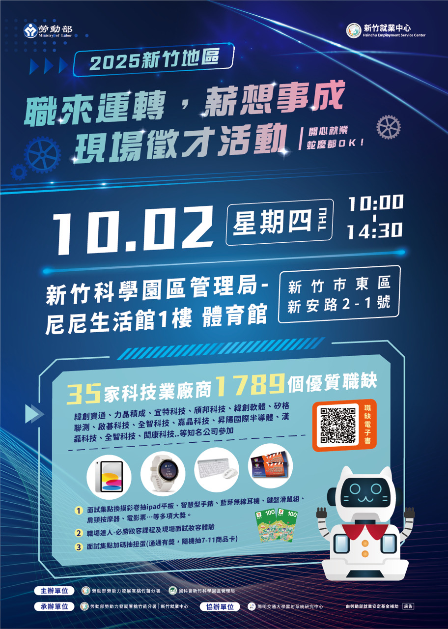 為協助求職者順利找到理想工作,勞動部勞動力發展署桃竹苗分署新竹就業中心將於10月2日(四)上午10時至下午2時30分,在新竹科學園區管理局尼尼生活館1樓體育館(新竹市東區新安路2-1號)舉辦「2025新竹地區職來運轉 薪想事成」現場徵才活動。
