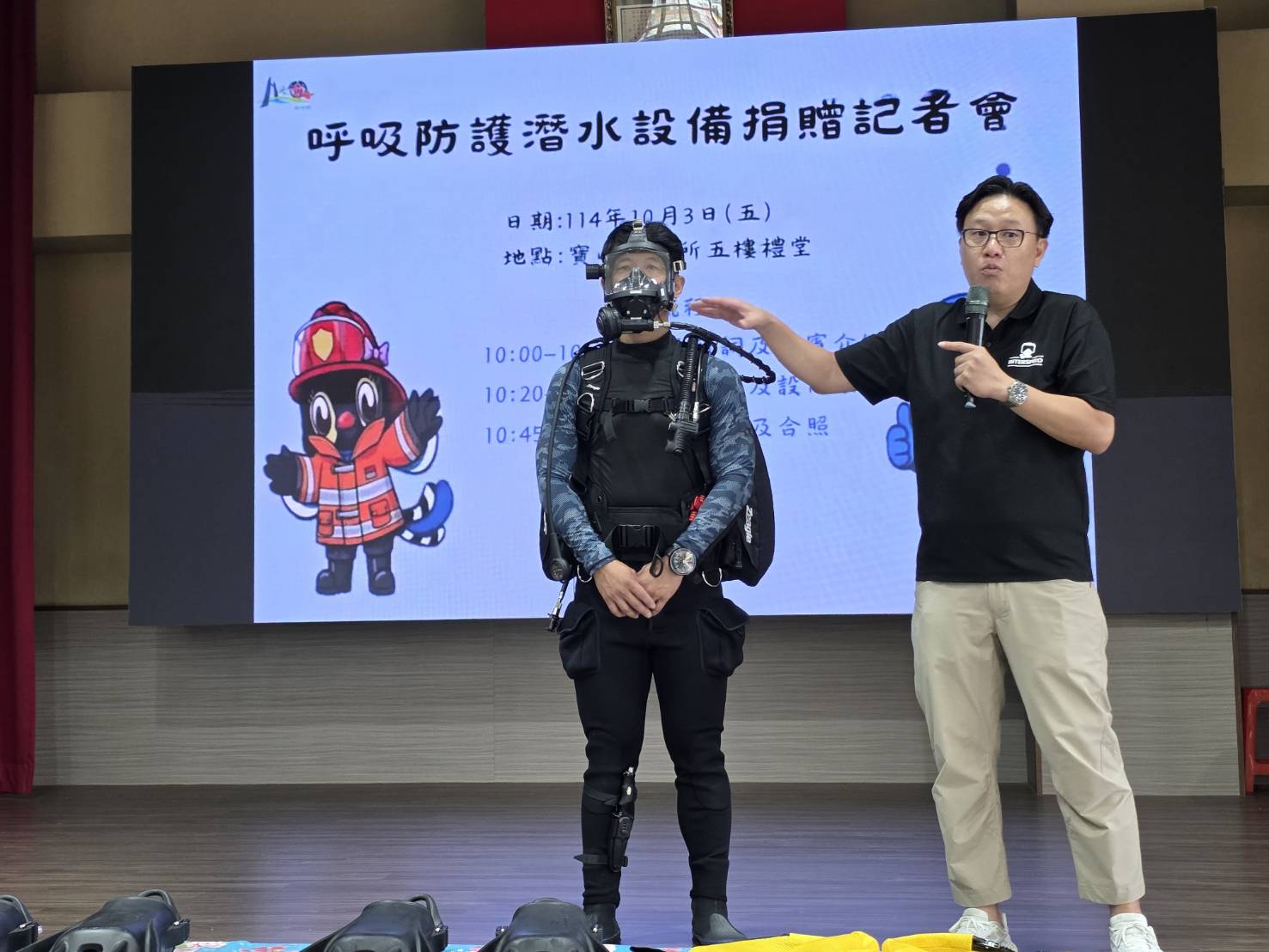 本次獲贈的潛水裝備可與消防局現有水下通訊系統整合,具備全面罩呼吸防護、低壓警報提醒與緊急救援系統,與消防署訓練中心今年最新之公共安全潛水裝備標準規格同步,讓寶山分隊成為全台首波配備最新、最完整潛水設備的消防單位。