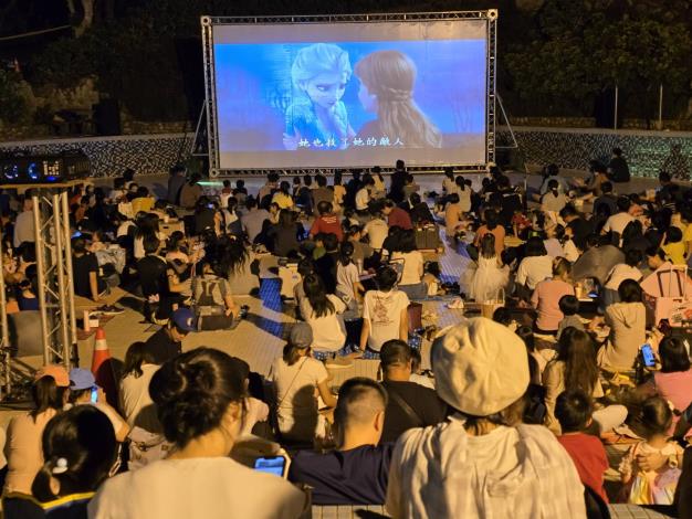 交旅處表示,當晚播放的是深受全齡觀眾喜愛的迪士尼動畫《冰雪奇緣2》,隨著電影配樂響起,全場輕聲唱和,笑聲與音樂交織成歡樂氛圍。乾冰特效在銀幕前緩緩飄散,營造出奇幻場景,令現場觀眾驚呼連連,彷彿置身艾倫戴爾王國。現場提供免費爆米花與茶飲,香氣四溢,成為觀影時最受歡迎的小確幸。